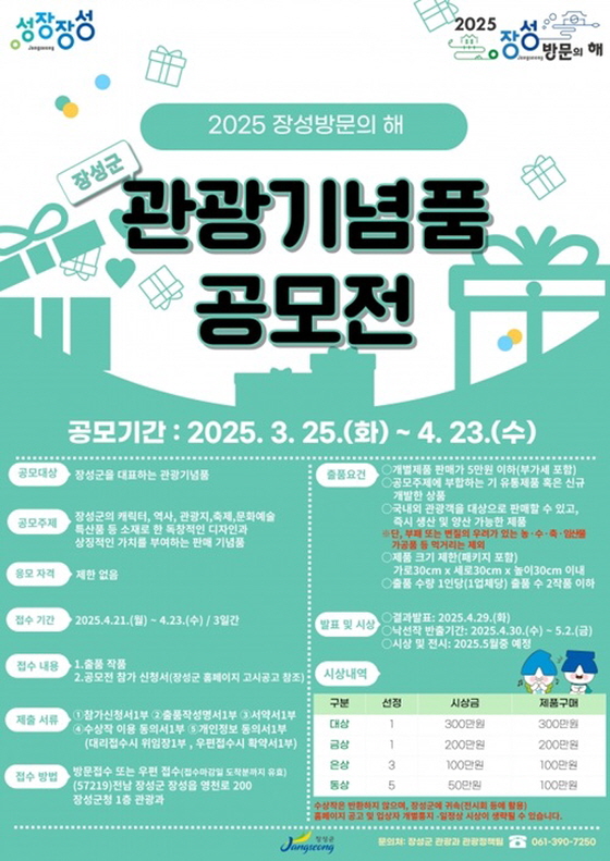 2025 장성방문의 해 관광기념품 공모전 공모분야 대회/전시/제작, 기타분야 접수기간2025.03.25 ~ 2025.04.23 D+288 종료 참가자격 기타 제한 주최장성군 1등상금(상품)500만원~1천만원 홈페이지 바로가기 첨부파일 다운로드 유의사항 ※본 내용은 참고 자료로 내용의 오류와 변동에 대해 책임지지 않습니다. (오류 및 변동 신고는 상단의 '제안/오류' 신고를 통해 해주십시오.) ※주최사 사정에 따라 일정 및 내용이 변경될 수 있으니 주최사 홈페이지 등을 통해 관련 안내를 수시로 확인하시기 바랍니다. 상세내용 ■ 제목2025 장성방문의 해 관광기념품 공모전 ■ 기간 - 접수 기간 : 2025. 3. 25.(화) ~ 4. 23.(수) 17:00까지 [30일간] ■ 참가자격상품화 및 제작․납품 능력을 갖춘 자 ■ 참여방법 / 접수방법<공모주제> 장성의 역사, 문화, 관광지 등 고유 특성을 잘 나타내고 독창적인 디자인과 성장장성의 상징적 가치를 지닌 관광기념품 <출품요건> - 개별제품 판매가 5만원 이하(부가세 포함) * 세트상품 구성 시 합계 금액을 기준으로 하며 최종 포장(패키지)이 완료된 제품의 금액 기준임 - 공모주제에 부합하는 기 유통제품 혹은 신규 개발한 상품 - 국내외 관광객을 대상으로 판매할 수 있고, 즉시 생산 및 양산 가능한 제품 ※ 단, 부패 또는 변질의 우려가 있는 농․수․축․임산물 가공품 등 먹거리는 제외 - 제품 크기 가로30cm×세로30cm×높이30cm 이내(패키지 포함) - 출품수량 : 1인당(1업체당) 출품 수 2작품 이하 · 공모전 참가신청서 제출 시 작품별로 신청서 제출 ☞ 2종의 작품 출품 시 신청서 2개 각각 제출 · 2건의 작품 출품 시 최고점 출품작만 시상, 그 외 출품작은 시상에서 제외 · 수저 세트(숟가락, 젓가락), 손톱깎이 세트 등과 같이 필수 세트 품목이거나 실제 한 묶음으로 판매되는 세트 작품은 1점으로 간주 · 전시 중 변질 및 파손 우려가 있는 작품은 안전장치를 할 것 · 출품작이나 출품작 주변장치에 출품자에 관한 사항을 표시할 수 없음 (성명, 업체명, 기타 정보 등) <응모제한> ▶ 양산 가능한 제품만을 공모대상으로 하며 입상 후에도 응모제한 사유에 해당되는 경우 입상 취소함 - 수상작 발표일로부터 60일 이내 납품이 불가능한 제품 - 저작권, 상표권, 특허권 등과 관련하여 법적 분쟁의 소지가 있는 제품 - 국내․외에 이미 상품화된 제품의 유사 작품 및 모조품 - 제품, 포장, 설명서 등이 하나의 세트로 구성되지 않은 제품 - 타 공모전 등에 출품하여 입상한 제품 - 보관·운반이 곤란하여 관광기념품으로의 상품화가 어려운 제품 - 주문 제작(OEM)하는 하청업체는 원 주문자의 제품을 출품할 수 없음 - 부패 및 변질의 위험이 있어 기념품으로 부적절한 제품 - 계속 생산이 불가한 제품 - 그 밖에 응모에 부적절하다고 판단되는 제품 등 ※ 기존의 상품 또는 타인의 아이디어를 모방한 내용을 출품하였을 경우 발생하는 모든 피해에 대한 책임은 출품자 본인에게 있음. <출품방법> - 접수기간 : 2025. 4. 21.(월) ~ 4. 23.(수) 10:00 ~ 17:00 [3일간] - 접수장소 : 장성군청 관광과 관광정책팀 (57219) 전남 장성군 장성읍 영천로 200 / 1층 관광과 - 접수방법 : 방문 또는 우편접수(접수마감일 도착분까지 유효) - 접수요령 : 현장 방문 접수 원칙이나, 부득이한 경우 우편 접수 가능 ·(현장방문) 본인 직접 출품 및 직접 반출을 원칙으로 하며, 대리의 경우 출품자의 위임장(신분증 첨부) 제출 [서식 6] ·우편(택배) 접수 시 포장된 상태로 보내야 하며 출품작의 파손, 분실 등에 대하여 책임지지 않으며, 손상 시 심사 감점 요인 ※ 우편 접수 시 [서식 7] 우편 제출 확약서 제출 <제출서류> 1) 출품작품 2) [서식 1] 참가신청서 3) [서식 2] 출품작 설명서 4) [서식 3] 서약서 5) [서식 4] 수상작 이용(홍보, 전시, 제작 등) 동의서 6) [서식 5] 개인정보 수집이용 동의서 7) [서식 6] 위임장(필요시) 8) [서식 7] 우편 제출 확약서(필요시) ※ 제출된 서류는 일체 반환하지 않음 ■ 시상내용 / 혜택 구분선정작품별총액시상금제품구매합계1010,50013,00023,500대상13,0003,0006,000금상12,0002,0004,000은상31,0001,0006,000동상55001,0007,500 ■ 유의사항 - 심사 후 기존 제품의 모방, 응모제한 위배, 부정한 방법 등으로 공모한 사실이 확인된 경우 입상 취소 및 시상금 회수 - 시상금의 제세공과금은 본인이 부담함 - 신청 시 기재 착오, 누락, 연락 불능 등에 따른 불이익은 본인책임 간주 - 출품 작품의 저작권은 원칙적으로 출품자에게 있으나, 수상작에 한하여 장성군이 기념품 및 작품집제작, 기타 광고·홍보 등에 활용·배포 등을 할 수 있음 - 지적재산권 분쟁 등의 법적 문제가 발생할 경우 출품자의 책임으로 함 - 출품자는 응모와 동시에 입상 시 공모전 요강에 기재되어 있는 이용 방법 및 조건의 범위 안에서 수상작 이용을 허락한 것으로 보고, 수상작의 저작재산권에 대한 이용료는 입상에 따른 시상금으로 대체함 - 기타 정하지 않은 사항이 발생할 시 주최 측의 결정에 따름 ■ 문의장성군 관광과 관광정책팀(☎061-390-7250) 목록