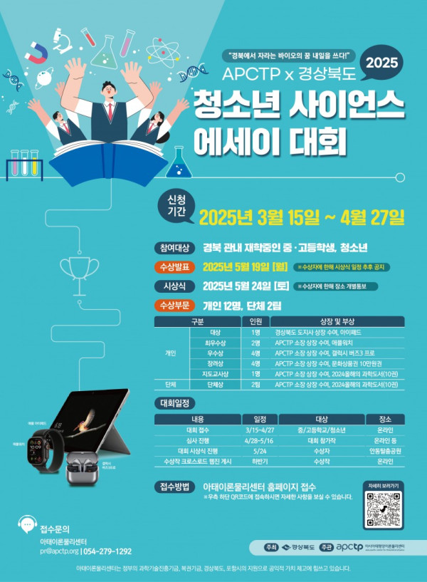 APCTP X 경상북도 청소년 사이언스 에세이 대회 공모분야 문학/시나리오 접수기간2025.03.15 ~ 2025.04.27 D+284 종료 참가자격 청소년, 지역한정 주최경상북도 주관(재)아시아태평양이론물리센터(APCTP) 1등상금(상품)기타 홈페이지 바로가기 첨부파일 다운로드 유의사항 ※본 내용은 참고 자료로 내용의 오류와 변동에 대해 책임지지 않습니다. (오류 및 변동 신고는 상단의 '제안/오류' 신고를 통해 해주십시오.) ※주최사 사정에 따라 일정 및 내용이 변경될 수 있으니 주최사 홈페이지 등을 통해 관련 안내를 수시로 확인하시기 바랍니다. 상세내용 ■ 제목APCTP X 경상북도 청소년 사이언스 에세이 대회 ■ 기간 - 모집기간: 2025. 3. 15 (토) ~ 2025. 4. 27 (일) (기한 엄수) - 수상발표: 2025. 5 . 19 (월) (APCTP 홈페이지 및 개별 연락) - 시상식: 2025. 5. 24(토) / 안동탈춤공원 ■ 참가자격 경북 관내 중 · 고등학교 학생 ■ 참여방법 / 접수방법 ◎ 주제: 경북 바이오연구단지에서 하고싶은 연구 주제 제안 ◎ 제목: 경북 바이오의 꿈, 내일을 위한 연구 제안 ◎ 부제: 경북에서 자라는 바이오의 꿈, 내일을 쓰다! ◎ 에세이 내용(예시) * 경북 지역의 바이오 관련 문제와 관심 분야를 바탕으로, 지역 특성에 맞는 바이오 산업 발전 가능성 탐색 * 개인적인 경험과 주변 환경을 반영하여, 바이오 산업에 기여할 수 있는 창의적이고 실용적인 연구 아이디어 제안 * 경북 바이오연구단지에서 발전할 수 있는 혁신적이고 재미있는 연구 방향 및 실현 가능성 * 지역 사회와 경제에 긍정적인 영향을 미칠 수 있는 연구 방법과 계획, 그리고 지역 사회와의 협력을 통한 연구 실현 방안 ◎ 분량: 3000~6000자 ■ 시상내용 / 혜택 - 대상 1명 : 경상북도 도지사 상장 수여, 아이패드 - 최우수상 2명 : APCTP 소장 상장 수여, 애플워치 - 우수상 4명 : APCTP 소장 상장 수여, 갤럭시 버즈3 프로 - 장려상 4명 : APCTP 소장 상장 수여, 문화상품권 10만원권 - 지도교사상 1명 : APCTP 소장 상장 수여, 2024 올해의 과학도서 10권 - 단체 대상 2팀 : APCTP 소장 상장 수여, 2024 올해의 과학도서 10권 ※ 단체 부분 시상은 각 참가자의 개별 점수를 합산하여 최고득점 단체, 최다접수 단체에 수여※ 지도교사상은 대상 수상 학생의 학교 지도교사에게 수여※ 단체 부분은 개인 에세이 접수 작성한 학교로 자동 신청됩니다. ■ 유의사항*접수 후, 기한 마감 전 에세이 접수 확인 페이지를 통해 본인의 에세이가 정상적으로 접수되었는지 확인 바랍니다. ■ 문의(재)아시아태평양이론물리센터 pr@apctp.org / 054)279-1292 목록