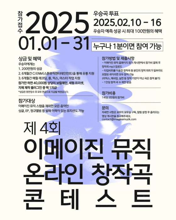 제4회 이메이진 뮤직 온라인 창작곡 콘테스트 공모분야 로고송/음악 접수기간2025.01.01 ~ 2025.01.31 D+377 종료 참가자격 제한없음 주최이메이진 뮤직 1등상금(상품)200만원~499만원 홈페이지 바로가기 첨부파일 다운로드 유의사항 ※본 내용은 참고 자료로 내용의 오류와 변동에 대해 책임지지 않습니다. (오류 및 변동 신고는 상단의 '제안/오류' 신고를 통해 해주십시오.) ※주최사 사정에 따라 일정 및 내용이 변경될 수 있으니 주최사 홈페이지 등을 통해 관련 안내를 수시로 확인하시기 바랍니다. 상세내용 ■ 제목제4회 이메이진 뮤직 온라인 창작곡 콘테스트 ■ 기간- 참가 접수 기간 : 2025.1.1~2025.1.31- 우승곡 투표 기간 : 2025.02.10.~2025.02.16 ■ 참가자격국내 모든 음악인, 본인 창작파트 일부라도 포함된 곡이 면 모두 참가 가능 ■ 참여방법 / 접수방법이메이진 뮤직 홈페이지 참가 게시판에서 참가비 결제 후 MP3 업로드 ■ 시상내용 / 혜택1. 우승자에게는 200만원의 상금2. 6개월간 Imagine Muzik X CJ ENM(스톤뮤직엔터테인먼트)을 통해 유통 지원3. 6개월간 매월 레코딩, 튠, 믹스, 마스터 작업 지원* 참가자 전원 이메이진 뮤직 자체 제작 플러그인, 프리셋, 보 컬체인 중 택 1 제공 ■ 문의보다 자세한 정보는 유튜브 ’꾜무의 꾜무실‘을 참고해 주시기를 바랍니다. 목록