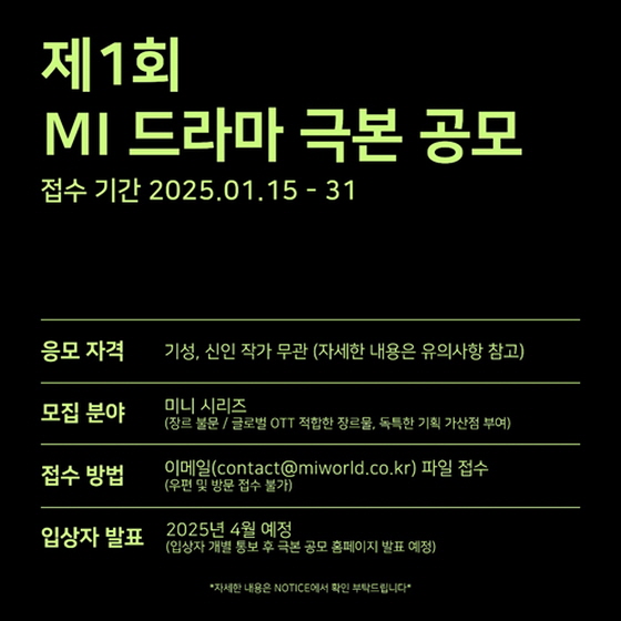제1회 엠아이 드라마 극본 공모 공모분야 문학/시나리오 접수기간2025.01.15 ~ 2025.01.31 D+376 종료 참가자격 제한없음 주최엠아이 1등상금(상품)1천만원 초과 홈페이지 바로가기 첨부파일 다운로드 유의사항 ※본 내용은 참고 자료로 내용의 오류와 변동에 대해 책임지지 않습니다. (오류 및 변동 신고는 상단의 '제안/오류' 신고를 통해 해주십시오.) ※주최사 사정에 따라 일정 및 내용이 변경될 수 있으니 주최사 홈페이지 등을 통해 관련 안내를 수시로 확인하시기 바랍니다. 상세내용 ■ 제목제1회 엠아이 드라마 극본 공모 ■ 기간~2025년 1월 31(금) 오후 6시까지 입상작 발표 : 4월 예정 ■ 참가자격기성, 신인 작가 무관 (유의사항 참고) ■ 참여방법 / 접수방법<공모 분야> - 미니 시리즈(장르불문/글로벌 OTT 적합한 장르물, 독특한 기획 가산점 부여) <제출요령> - 지원서 : 첨부파일 작성 - 시놉시스 : A4 20매 내외 (기획의도, 인물설정, 줄거리 포함) - 대본 : 회당 A4 35매 내외의 대본 1, 2부 <제출형식>※ 반드시 홈페이지의 내용을 참조하여 정해진 형식으로 제출 <접수 방법> - 이메일 contact@miworld.co.kr 파일 접수 (우편 및 방문접수 불가) ■ 시상내용 / 혜택 - 대상 : 5000만원 - 우수상 : 2000만원 - 가작 : 1000만원 * 우수한 작품이 있을 경우 추가 시상할 수 있으며, 적합한 작품이 없을 경우 시상하지 않을 수 있습니다. ■ 유의사항반드시 홈페이지의 유의사항 참조 ■ 문의contact@miworld.co.kr [공모전 문의]를 말머리로 필수 표기 (전화문의 받지 않음) 목록