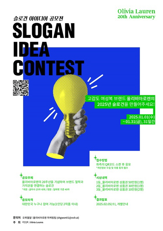 올리비아로렌 20주년 기념 슬로건 공모전 공모분야 네이밍/슬로건 접수기간2025.01.01 ~ 2025.01.31 D+376 종료 참가자격 제한없음 주최올리비아로렌 1등상금(상품)100만원 이하 홈페이지 바로가기 첨부파일 다운로드 유의사항 ※본 내용은 참고 자료로 내용의 오류와 변동에 대해 책임지지 않습니다. (오류 및 변동 신고는 상단의 '제안/오류' 신고를 통해 해주십시오.) ※주최사 사정에 따라 일정 및 내용이 변경될 수 있으니 주최사 홈페이지 등을 통해 관련 안내를 수시로 확인하시기 바랍니다. 상세내용 ■ 제목올리비아로렌 20주년 기념 슬로건 공모전 ■ 기간✿ 기간 : 25.01.01(수) ~ 25.01.31(금)✿ 발표 : 25.02.05 (수) 개별 안내 ■ 참가자격다양한 아이디어를 가진 누구나 참여 가능 ■ 참여방법 / 접수방법✿ 주제올리비아로렌의 20주년을 기념하여 브랜드 철학과 가치관을 연결하는 슬로건 올리비아로렌은 고급스러운 소재와 실용적인 디자인으로Ageless & Timeless 스타일을 선보이는 고감도 여성복 브랜드입니다. * 국영문 모두 가능 / 1인당 2작품 이내* 국문 슬로건 : 글자 수 25자 내외* 영문 슬로건 : 알파벳 기준 40자 ✿ 참여 방법QR코드 스캔 또는 프로필 링크 클릭* 개인정보 수집 및 이용 동의 필수 ■ 시상내용 / 혜택1등. 올리비아로렌 상품권 50만 원 (1명)2등. 올리비아로렌 상품권 30만 원 (1명)3등. 올리비아로렌 상품권 10만 원 (2명) ■ 유의사항- 제출된 공모 작품은 반환되지 않습니다.- 서류 누락 경우에는 심사 대상에서 제외됩니다.- 슬로건은 올리비아로렌의 슬로건으로 활용됩니다.- 표절이 의심되는 경우에는 수상이 취소될 수도 있습니다.- 타 공모전 수상 경력이 있는 작품일 경우 심사 대상에서 제외됩니다. 목록