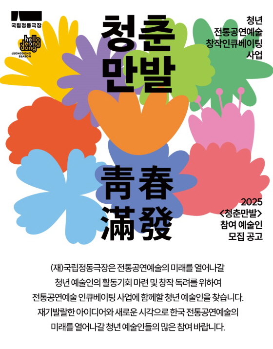2025 청년 전통공연예술 창작인큐베이팅 사업 모집공고 공모분야 기획/아이디어/마케팅, 사진/영상, 기타분야 접수기간2024.12.26 ~ 2025.01.31 D+376 종료 참가자격 기타 제한 주최국립정동극장 1등상금(상품)500만원~1천만원 홈페이지 바로가기 첨부파일 다운로드 유의사항 ※본 내용은 참고 자료로 내용의 오류와 변동에 대해 책임지지 않습니다. (오류 및 변동 신고는 상단의 '제안/오류' 신고를 통해 해주십시오.) ※주최사 사정에 따라 일정 및 내용이 변경될 수 있으니 주최사 홈페이지 등을 통해 관련 안내를 수시로 확인하시기 바랍니다. 상세내용 ■ 제목2025 청년 전통공연예술 창작인큐베이팅 사업 <청춘만발> 모집공고 ■ 기간~ 2025년 1월 31일까지 ■ 참가자격19세~34세, 청년 전통공연예술인(개인 및 단체)* 1991년 1월 이후 출생~ 2006년 12월 이전 출생자지원 가능* 전통공연예술 장르 전공의 대학 및 대학원 재학 중일 경우, 나이제한없음* 2인 이상의 다수구성팀일 경우, 참여자 전원이 청년 예술인에 해당되어야함 ■ 참여방법 / 접수방법<분야>- 한국 전통공연예술 콘텐츠의 미래를 열어나갈 청년 예술인이 창작, 실연의 주체가 된 공연- 50분 내외의 무대 공연이 가능한 프로그램 구성 <공모 주제> - 제한없음 <작품요건>- 국내외 동일 장르로 발표가 되지 않은 공연* 단, 발표된 곡, 장면이라도 전체 공연의 30% 이하로 구성에 포함은 가능- 전통공연예술의 순수창작, 재구성, 재창작, 장르 간 협업 등 우리 전통공연예술을 보존하고 개발하고자 하는 아이디어가 반영된 무대 공연- 타 장르와 장르 간 협업이나 원작이 있는 공연의 경우, 협업에 대한 동의를 받은 공연, 저작권이나 공연권을 취득한 공연, 혹은 참여 선정 후 공연 이전에 확보가 가능한 공연 <신청방법>온라인접수https://jeongdong.fairyhr.com (이메일, 우편 접수 등 불가) <필수제출파일>1. 참가신청서 1부(공통양식/ 온라인접수)2. 개인정보제공동의서(공통양식/온라인제출)3. 동영상 자료 [5분 이내, 참가팀 예정 공연의 일부 시연장면을 촬영한 동영상(최대 2개)] ■ 시상내용 / 혜택1. 올해의 최고 아티스트(총 1팀)- 올해의 최고 아티스트 지원금 1,000만원- 국립정동극장과 연계한 유관기관 축제 공연 출연- 국립정동극장 기획공연 출연 2. 우수 아티스트(총 1팀)- 우수 아티스트 지원금 500만원- 국립정동극장과 연계한 유관기관 축제 공연 출연 3. 인기 아티스트(총 1팀)- 인기 아티스트 지원금 100만원- 국립정동극장과 연계한 유관기관 축제 공연 출연 4. 선정 아티스트(0팀 이내)- 창작지원금 100만원- '국립정동극장 세실 공연장 무대제공 및 기술지원- 작품 제작·연출 지원- 멘토링 지원- 인력 지원(기획, 홍보, 티켓·하우스 운영 등)- 통합 홍보(언론, 홈페이지, 블로그, SNS 등)※ 유의사항 : 지원자 혹은 지원단체의 개인사정으로 공연에 참가하지 못할 경우 창작지원금이 회수될 수 있음. ■ 유의사항자세한 내용은 공모 홈페이지 참조 ■ 문의culture@jeongdong.or.kr 목록