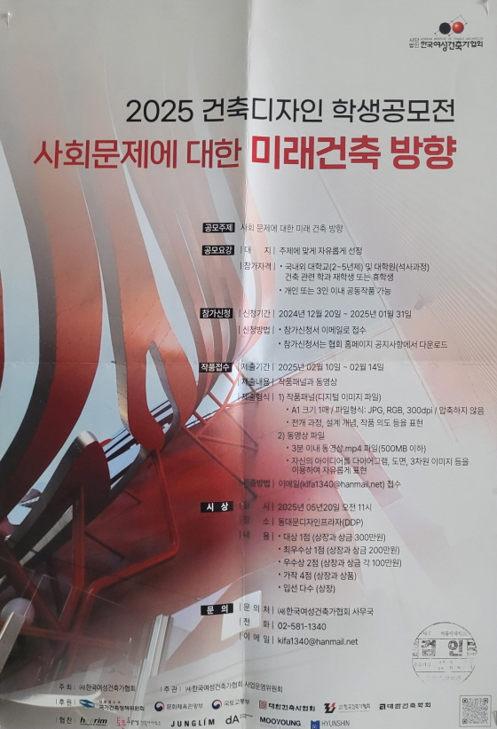 2025 건축디자인 학생공모전 공모분야 건축 설계/건축디자인 접수기간2025.01.01 ~ 2025.01.31 D+376 종료 참가자격 대학(원)생/청년 주최한국여성건축가협회 1등상금(상품)200만원~499만원 홈페이지 바로가기 첨부파일 다운로드 유의사항 ※본 내용은 참고 자료로 내용의 오류와 변동에 대해 책임지지 않습니다. (오류 및 변동 신고는 상단의 '제안/오류' 신고를 통해 해주십시오.) ※주최사 사정에 따라 일정 및 내용이 변경될 수 있으니 주최사 홈페이지 등을 통해 관련 안내를 수시로 확인하시기 바랍니다. 상세내용 ■ 제목2025 건축디자인 학생공모전 ■ 기간2024.12.20(금) ~ 2025.01.31.(금) ■ 참가자격- 국내외 대학교(2~5년제) 및 대학원(석사과정)의 건축관련학과 재학생 또는 휴학생- 개인 또는 3인 이내 공동작품 가능 ※ 참가등록 당시 학생 신분 혹은 입학 예정을 증명할 수 있는 자 모두 참가 가능하며, 입학 취소자는 추후 수상에서 제외됨. (2025년 2월 졸업 예정자 참가가능) ■ 참여방법 / 접수방법<공모 주제> 사회 문제에 대한 미래 건축 방향 1. 참가신청 신청기간: 2024년 12월 20일 ~ 1월 31일(1) 참가신청서(2) 재학증명서 또는 입학증명서 PDF 파일 (파일명: 250000 재학증명서)(3) 개인정보 수집 및 이용에 관한 동의서 1부 신청방법- 이메일(kifa1340@hanmail.net) 접수- 참가신청서류는 협회 홈페이지 공지사항에서 다운로드- 참가비용: 3만원- 접수번호는 2025년 1월 중에 참가신청서를 제출한 신청자의 이메일로 회신 2. 작품 접수- 접수 기간 : 2025.02.10(월)~2025.02.14(금)- 제출 내용 : 작품 패널과 동영상- 제출 형식 : 1) 작품패널 (A1 크기 1매 / 파일 형식 : JPG, RGB, 300dpi / 압축하지 않음) 2) 동영상 파일 {3분 이내 동영상.mp4 파일(500MB이하)} - 제출 방법 : 이메일(kifa1340@hanmail.net)접수- 주의사항 (1) 작품 파일에 인적 정보(이름, 학교 등) 노출 금지 (2) 단, 이메일 상의 인적 정보는 무관(심사자들에게 공개되지 않음.) (3) 수정본을 여러 차례 제출한 경우, 제출 기한 내 도착한 마지막 메일만 인정됨. ■ 시상내용 / 혜택- 대상 1점 (상장과 상금 300만원)- 최우수상 1점 (상장과 상금 200만원)- 우수상 2점 (상장과 상금 각 100만원)- 가작 4점 (상장과 상품)- 입선 다수 (상장) ■ 유의사항자세한 내용은 공고문 참조 ■ 문의 (사)한국여성건축가협회 사무국 - 전화 : 02-581-1340 - 이메일: kifa1340@hanmail.net 목록