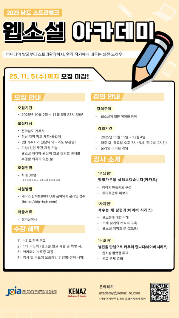 2025 남도 스토리뱅크 웹소설 아카데미 모집 공모분야 문학/시나리오 접수기간2025.10.02 ~ 2025.10.31 D+99 종료 참가자격 지역한정 주최전남정보문화산업진흥원 주관주식회사 케나즈 1등상금(상품)기타 홈페이지 바로가기 첨부파일 다운로드 유의사항 ※본 내용은 참고 자료로 내용의 오류와 변동에 대해 책임지지 않습니다. (오류 및 변동 신고는 상단의 '제안/오류' 신고를 통해 해주십시오.) ※주최사 사정에 따라 일정 및 내용이 변경될 수 있으니 주최사 홈페이지 등을 통해 관련 안내를 수시로 확인하시기 바랍니다. 상세내용 “인기 웹소설 작가와 함께하는 아카데미”5주 만에 나만의 웹소설을 완성하고, 작가에게 직접 듣는 투고·연재 노하우!웹소설 시장은 매년 폭발적으로 성장하고 있습니다.하지만 막상 쓰려니 어디서부터 시작해야 할지 막막하지 않으신가요?이번 아카데미는 전남 지역 창작자를 위한 맞춤형 프로그램으로,AI 활용 아이디어 발굴부터 투고·계약·OSMU까지 실전형 커리큘럼을 제공합니다.■ 모집대상 - 전라남도 거주자 - 전남 지역 학교 재학 or 졸업자(현 거주지가 전라남도가 아니어도 가능) - 정원: 최대 30명, 신인/기성/나이 무관■ 모집일정 지원서 접수기간: 2025년 10월 2일(목) ~ 11월 5일(수) 23:59까지※ 선발 절차(필요 시): 서류 접수 → 최종합격자 발표(2025년 11월 7일 개별 연락) ■ 교육운영 교육기간: 2025년 11월 11일(화) ~ 12월 4일(목) (총 4주 과정) 교육시간: 매주 화·목요일 오후 7시 ~ 9시 (주 2회, 회당 2시간) 교육방식: 온라인 라이브 강의 ※ 선택사항으로 오프라인 간담회 진행 가능 ■ 지원방법 킵허브 홈페이지(www.kip-hub.com) 접속 후 회원가입 아카데미 상세페이지 내 지원하기 버튼 클릭 지원서 양식에 맞춰 신청서 작성 및 제출 ■ 강사진 무니랑 작가 : 장르 웹소설 전문, 다수 플랫폼 연재 및 강의 경력 사지현 작가 : 로맨스/로판 전문, 계약·투고 실무 강의 다수 누오바 작가 : 현업 연재 작가, 플랫폼 투고 및 계약 경험 풍부 ■ 교육 커리큘럼 웹소설 장르 이해 및 로맨스 특징 소재·캐릭터 만들기 (AI 활용 소재 찾기) 이야기 구성 1 (AI 활용 팁) 이야기 구성 2 (AI 자료조사 응용) 트리트먼트 작성 및 원고 실습 플랫폼 투고 전략 심사고 준비 퇴고·계약·OSMU ※ 커리큘럼은 실제 진행 시 일부 변경될 수 있음■ 교육장소온라인 라이브 강의 (추후 오프라인 간담회 별도 공지)■ 수강료무료 (전남문화진흥원 전액 지원)■ 참고 및 문의 이메일: academy@kenaz-re.com 홈페이지: www.kip-hub.com 목록