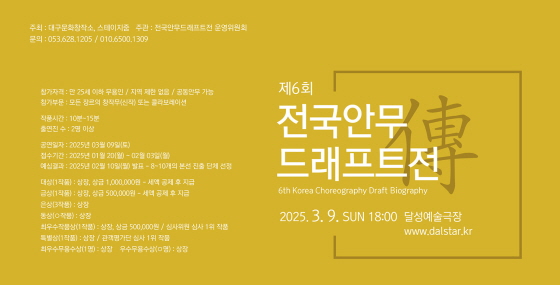 제6회 전국안무드래프트전 참가단체 모집 공모분야 사진/영상, 기타분야 접수기간2025.01.20 ~ 2025.02.10 D+365 종료 참가자격 기타 제한 주최대구문화창작소, 스테이지줌 주관전국안무드래프트전 운영위원회 1등상금(상품)100만원~199만원 홈페이지 바로가기 첨부파일 다운로드 유의사항 ※본 내용은 참고 자료로 내용의 오류와 변동에 대해 책임지지 않습니다. (오류 및 변동 신고는 상단의 '제안/오류' 신고를 통해 해주십시오.) ※주최사 사정에 따라 일정 및 내용이 변경될 수 있으니 주최사 홈페이지 등을 통해 관련 안내를 수시로 확인하시기 바랍니다. 상세내용 ■ 제목제6회 전국안무드래프트전 참가단체 모집 ■ 기간접수기간 : 2025년 01월 20일(월) ~ 02월 10일(월) 마감 (포스터 일정보다 일주일 뒤로 접수 기간 연장)예심결과 : 2025년 02월 17일(월) 발표 / 8~10개의 본선 진출 단체 선정조명리허설 : 2025년 03월 01일(토) 3~4작품, 03월 08일(토) 3~4작품 2025년 03월 09일(일) 오전 2~3작품경연일자(본선) : 2025년 03월 09일(일) / 달성예술극장비경연 : 2025년 03월 23일(일) / 달성예술극장 ■ 참가자격만 25세 이하 무용인 / 대학생 참가 가능 / 국적ㆍ지역 제한 없음 / 공동안무(2인 이하) 가능 ■ 참여방법 / 접수방법참가부문 : 모든 장르의 창작무 또는 콜라보레이션 ※ 신작인 경우 총점에서 가산점 1.5점 적용, 신작이 아닌 작품도 참가 가능 ※ 신작이 아닌 기 발표작도 '작품영상'이 아니라 별도의 '연습영상'을 촬영해서 제출 ※ 학과발표회, 창작발표회, 졸업발표회 등 교내 발표회에 오른 작품은 기 발표작으로 봅니다. 작품시간 : 10분~15분 규정 시간을 벗어나면 협의 후 감점할 수 있습니다. 출연진(무용수) 수 : 2명 이상, 8명 이내 출연진이 2명일 때 - 모두 만 25세 이하 출연진이 3~5명일 때 - 미자격자 허용 인원 1명 출연진이 6~8명일 때 - 미자격자 허용 인원 2명 <참가신청>- dalstar.kr@gmail.com으로 소정의 참가신청서와 연습영상(10분 내외)을 전송※ 신작이 아닌 기 발표작도 '작품영상'이 아닌 별도의 '연습영상'을 촬영해서 제출 > 영상의 편집 여부는 심사에 영향을 미치지 않습니다. > 풀샷 영상을 권장하며, 인물이 화면 밖으로 나갈 경우 자연스럽게 따라가는 영상도 좋습니다. > 풀샷 영상 기본 제출, 편집(클로즈업 등) 영상 추가 제출 가능 > 영상의 파일명에는 제목만 표기 > 화면에 단체명, 출연자명 표시 금지, 제목은 가능 - 중요! > 인물이 너무 작아 보이지 않도록 주의. 심사에 나쁜 영향을 줍니다. > 화질 좋은 영상이 나쁜 영향을 주지는 않습니다. 되도록 촬영한 원본 파일을 그대로 메일로 보내 주세요. > 카카오톡으로 주고받은 영상은 화질이 좋지 않습니다. > 예선 영상심사는 심사위원 각자의 공간에서, 각자의 단말기(PC, 스마트폰, 스크린)를 통해 이루어집니다.- 예심을 거친 후 선정 결과를 개별 통보- 메일로 신청서 전송 후에 010.6500.1309로 문자 메시지 발송- 접수한 영상과 같은 작품으로 본선에 참가해야 합니다. 일부 수정, 보완 가능.- 기 발표작의 제목을 바꾸어 신작으로 거짓 참가신청할 경우, 나중에라도 수상을 취소함은 물론 안무자 실명과 함께 공지합니다. <티켓판매수익금 배분>- 각 단체별 판매 수익금의 50%를 각 단체에 지불 <보증금>- 참가 신청하는 모든 단체는 공연 보증금 150,000원을 아래 계좌로 납부- 국민은행 129 21 0013 684 이재봉* 보증금은 예선 심사 후 또는 본선 경연 후에 돌려드립니다.- 본선에 진출하지 못한 팀은 예선 심사 후에, 본선에 진출한 팀은 본선 경연 후에 돌려드립니다.* 신청 후, 참가팀 사정으로 테크니컬 리허설 및 경연에 참가하지 못할 경우 보증금을 돌려드리지 않습니다.- 신중을 기해 주시기 바랍니다. ■ 시상내용 / 혜택시상 : 종합- 대상(1작품) : 상장, 상금 1,000,000원- 금상(1작품) : 상장, 상금 500,000원- 은상(3작품) : 상장- 동상(○작품) : 상장 시상 : 작품부문- 최우수작품상(1작품) : 상장, 상금 500,000원 / 심사위원 심사 1위 작품 > 대상, 금상 수상작과 중복될 경우 상금은 중복 지급하지 않음- 우수작품상(○작품) : 상장 / 심사위원 심사 2위~○위 작품- 달스타그랑프리(○작품) : 상장, 상금 00,000원 / 달성예술극장 초이스- 특별상(○작품) : 상장 / 온라인관객평가단 심사 1위~○위 작품 시상 : 무용수부문- 최우수무용수상(1명) : 상장- 우수무용수상(○명) : 상장 ■ 유의사항- 본선은 유튜브 '달성예술극장' 채널에서 생중계합니다.- 주최 측에서 촬영한 사진과 영상은 주최 측 홍보 자료로 사용할 수 있습니다. 기타 자세한 사항은 홈페이지 공고를 확인 부탁드립니다. ■ 문의053.628.1205 / 010.6500.1309 목록