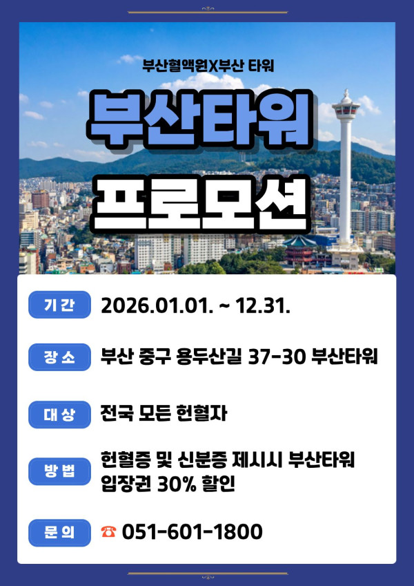 헌혈자 부산타워 할인 프로모션 접수기간2026.01.01 ~ 2026.12.31 D-284 접수중 참가자격 기타 제한 주최부산타워, 부산혈액원 주관부산타워, 부산혈액원 1등상금(상품)기타 홈페이지 바로가기 첨부파일 다운로드 유의사항 ※본 내용은 참고 자료로 내용의 오류와 변동에 대해 책임지지 않습니다. (오류 및 변동 신고는 상단의 '제안/오류' 신고를 통해 해주십시오.) ※주최사 사정에 따라 일정 및 내용이 변경될 수 있으니 주최사 홈페이지 등을 통해 관련 안내를 수시로 확인하시기 바랍니다. 상세내용 ■ 제목헌혈자 부산타워 할인 프로모션 ■ 기간 - 2026년 1월 1일 ~ 2026년 12월 31일 ■ 참가자격전국 모든 헌혈자 ■ 방법헌혈증 및 신분증 제시 시 부산타워 입장권 30% 할인 ■ 문의 - 전화 : 051-601-1800 목록