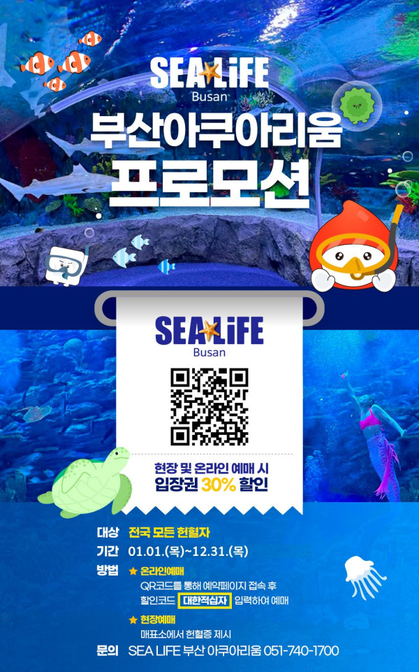 헌혈자 부산 아쿠아리움 할인 프로모션 접수기간2026.01.01 ~ 2026.12.31 D-284 접수중 참가자격 기타 제한 주최부산아쿠아리움, 부산혈액원 주관부산아쿠아리움, 부산혈액원 1등상금(상품)기타 홈페이지 바로가기 첨부파일 다운로드 유의사항 ※본 내용은 참고 자료로 내용의 오류와 변동에 대해 책임지지 않습니다. (오류 및 변동 신고는 상단의 '제안/오류' 신고를 통해 해주십시오.) ※주최사 사정에 따라 일정 및 내용이 변경될 수 있으니 주최사 홈페이지 등을 통해 관련 안내를 수시로 확인하시기 바랍니다. 상세내용 ■ 제목헌혈자 부산 아쿠아리움 할인 프로모션 ■ 기간 - 2026년 1월 1일 ~ 2026년 12월 31일 ■ 참가자격전국 모든 헌혈자 ■ 방법현장 예매 - 매표소에서 헌혈증 제시 2. 온라인 예매 - QR코드를 통해 예약페이지 접속 후 할인코드 “대한적십자” 입력하여 예매 ■ 문의 - 전화 : 051-740-1700 목록