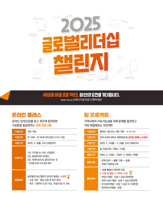 NSI 2025년 글로벌리더십 챌린지 모집 공모분야 기타분야 접수기간2025.02.10 ~ 2025.03.03 D+343 종료 참가자격 대학(원)생/청년 주최재단법인 NSI 1등상금(상품)200만원~499만원 홈페이지 바로가기 첨부파일 다운로드 유의사항 ※본 내용은 참고 자료로 내용의 오류와 변동에 대해 책임지지 않습니다. (오류 및 변동 신고는 상단의 '제안/오류' 신고를 통해 해주십시오.) ※주최사 사정에 따라 일정 및 내용이 변경될 수 있으니 주최사 홈페이지 등을 통해 관련 안내를 수시로 확인하시기 바랍니다. 상세내용 ■ 제목NSI 2025년 글로벌리더십 챌린지 모집 ■ 개요세상을 바꿀 로컬 액션, 당신의 도전을 기다립니다.2025년 글로벌리더십 챌린지는 <온라인 클래스>와 <팀 프로젝트>를 통해 세계시민으로서의 역량을 이해하고 실천해 볼 수 있는 활동입니다. [온라인 클래스]총 3개의 영상으로 구성된 강연 프로그램입니다. 강의 시청 후 퀴즈에 합격하시면 수료증을 발급해 드립니다. [팀 프로젝트]팀 단위 활동으로 전문가로부터 피드백을 받으며, 직접 지역사회의 문제를 정의하고 해결해 보는 프로젝트입니다. 서류 전형과 면접 전형을 거쳐 프로젝트 참가자로 선발될 경우 팀별 활동비(30만원)가 지급됩니다. 또한 총 상금 1,000만원에 도전하실 수 있으며, 본상(1~5등)을 수상하지 못하더라도 전원 장려상이 지급됩니다. ■ 기간1) 온라인 클래스 : 2025.1.6(월) ~ 3.3(월) 23:59분까지 지원 및 퀴즈 응시- 1/13(월)부터 지원하신 이메일로 강의 영상 보내드립니다.- 수료증 발송 시점(1) 1/22(수) 제공 : 1/13(월) ~ 1/21(화) 퀴즈 합격자(2) 2/12(수) 제공 : 1/22(수) ~ 2/11(화) 퀴즈 합격자(3) 3/12(수) 제공 : 2/12(수) ~ 3/3(월) 퀴즈 합격자 2) 팀 프로젝트 : 온라인 클래스 수료자에게 지원방법 및 세부 일정을 추가 안내 예정- 서류전형: 2025.2.10(월) ~ 3.3(월)- 면접전형: 2025.3.5(수) ~ 3.6(목)- 합격자 발표: 2025.3.11(화)* 상세 활동 일정은 포스터를 참고해 주시기 바랍니다. ■ 참가자격- 온라인 클래스 : 청년 누구나 (만19세 이상 ~ 만34세 이하)- 팀 프로젝트 : 온라인 클래스 수료자 중 전국 4년제 대학교 재/휴학생 ■ 참여방법 / 접수방법지원방법 (링크 클릭 후 구글폼 작성)https://forms.gle/qPPiPjbXcCzvCXG5A ■ 시상내용 / 혜택1) 온라인 클래스 : <글로벌리더십 챌린지> 온라인 클래스 수료증 2) 팀 프로젝트 : 총 상금 1,000만원 / 팀별 활동비 30만원- 대상(1개팀) : 상장 + 상금 400만원- 최우수상(1개팀) : 상장 + 상금 300만원- 우수상(3개팀) : 상장 + 상금 각 100만원- 장려상(10개팀) : 상장 ■ 유의사항1) 팀 프로젝트의 모든 활동은 서울에서 진행되며, 교통비는 지원하지 않습니다. 2) 팀 프로젝트는 팀별(5인) 지원을 권장합니다.- 5인 미만 또는 개인 지원 시 운영사무국에서 팀 매칭을 시도할 수 있으나, 매칭이 이루어지지 않을 경우 최종 합격자로 선발되지 않을 수 있습니다. ■ 문의- 카카오톡 오픈채팅 : 글로벌리더십챌린지- TEL : 070-4402-7799 (NSI 미래교육센터)- E-MAIL : nsichallenge@gmail.com 목록