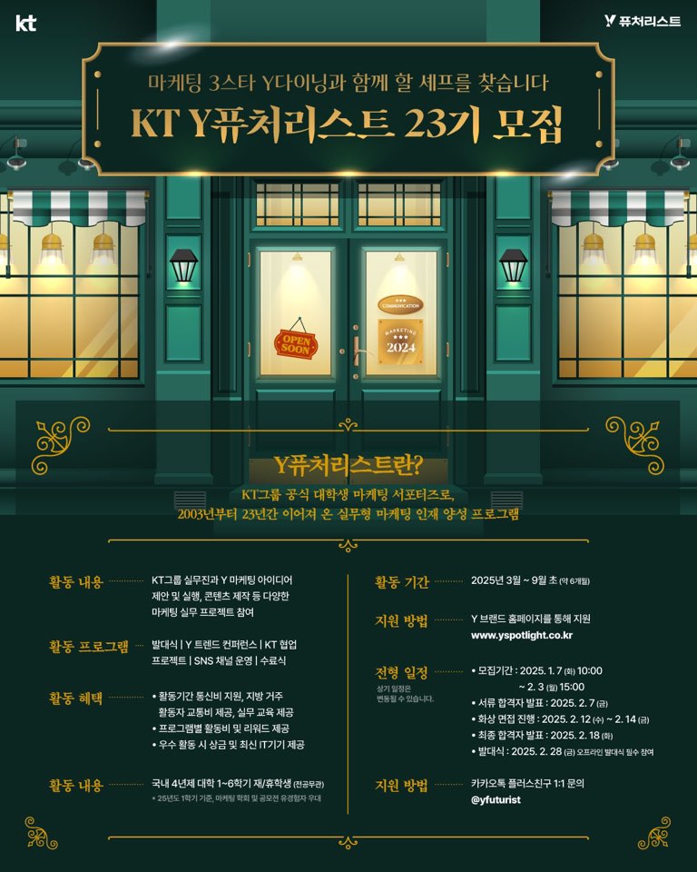[KT] Y퓨처리스트 23기 모집 공모분야 기타분야 접수기간2025.01.07 ~ 2025.02.03 D+371 종료 참가자격 대학(원)생/청년 주최KT 1등상금(상품)기타 홈페이지 바로가기 첨부파일 다운로드 유의사항 ※본 내용은 참고 자료로 내용의 오류와 변동에 대해 책임지지 않습니다. (오류 및 변동 신고는 상단의 '제안/오류' 신고를 통해 해주십시오.) ※주최사 사정에 따라 일정 및 내용이 변경될 수 있으니 주최사 홈페이지 등을 통해 관련 안내를 수시로 확인하시기 바랍니다. 상세내용 ■ 제목[KT] Y퓨처리스트 23기 모집 ■ 개요Y퓨처리스트는 KT그룹 공식 대학생 마케팅 서포터즈로, 2003년부터 23년간 이어져온 실무형 마케팅 인재 양성 프로그램입니다.Y브랜드 마케팅 아이디어 제안과 실행, 콘텐츠 제작 등 KT의 다양한 마케팅 실무에 참여할 수 있습니다. ■ 기간모집기간 : 2025년 1월 7일 (화) ~ 2월 3일 (월) 15:00 활동기간 : 2025년 3월 ~ 9월초 (약 6개월) ▪ 서류 합격자 발표: 2025년 2월 7일 (금) *서류 합격자 대상으로 팀별 사전 미션이 진행됩니다. ▪ 화상 면접 진행: 2025년 2월 12일 (수) ~ 2월 14일 (금) ▪ 최종 합격자 발표: 2025년 2월 18일 (화) ▪ 발대식: 2025년 2월 28일 (목) *오프라인 발대식 필수 참여 *상기 일정은 변동될 수 있습니다. ■ 참가자격국내 4년제 대학 1~6학기 재/휴학생 (전공무관)※ 25년도 1학기 기준, 마케팅학회 및 공모전 유경험자 우대 ■ 참여방법 / 접수방법<지원방법> Y 브랜드 홈페이지를 통해서 지원 <활동 내용>- 발대식, Y트랜스 컨퍼런스, KT 협업 프로젝트, SNS 채널 운영, 수료식 ■ 시상내용 / 혜택- 활동기간 통신비 지원- 지방 거주 활동자 교통비 제공- 실무 교육 제공- 프로그램 별 활동비 및 리워드 제공- 우수 활동 시 상금 및 최신 IT 기기 제공 ■ 유의사항홈페이지 참조 ■ 문의카카오 플러스 친구 1:1 문의@yfuturist 목록