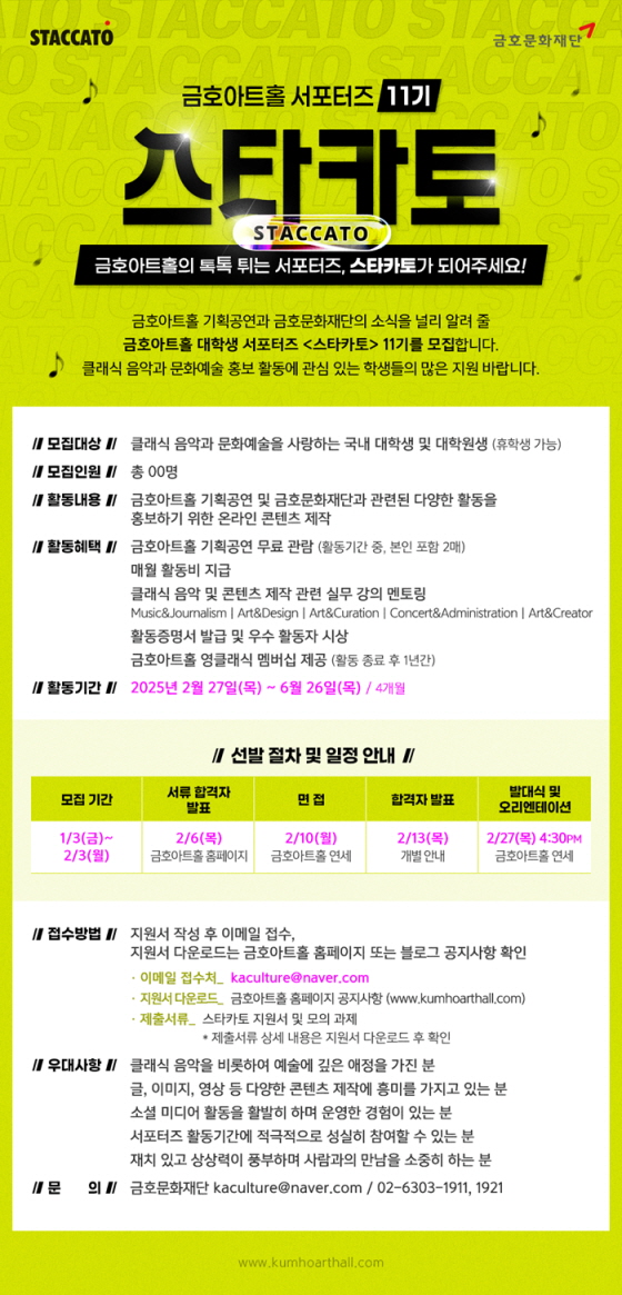[금호문화재단] 2025 금호아트홀 서포터즈 11기 모집 공모분야 기타분야 접수기간2025.01.03 ~ 2025.02.03 D+371 종료 참가자격 대학(원)생/청년 주최금호문화재단 1등상금(상품)기타 홈페이지 바로가기 첨부파일 다운로드 유의사항 ※본 내용은 참고 자료로 내용의 오류와 변동에 대해 책임지지 않습니다. (오류 및 변동 신고는 상단의 '제안/오류' 신고를 통해 해주십시오.) ※주최사 사정에 따라 일정 및 내용이 변경될 수 있으니 주최사 홈페이지 등을 통해 관련 안내를 수시로 확인하시기 바랍니다. 상세내용 ■ 제목[금호문화재단] 2025 금호아트홀 서포터즈 <스타카토> 11기 모집 ■ 기간모집기간 : 1/3(금) ~ 2/3(월) / 세부일정 이미지 참고 활동기간 : 2025/2/27(목) ~ 6/26(목) / 4개월 ■ 참가자격 클래식 음악과 문화예술을 사랑하는 국내 대학생 및 대학원생 (휴학생 가능) 모집인원 : 총 00명 ■ 참여방법 / 접수방법- 지원서 작성 후, 이메일 접수- 이메일 접수처 kaculture@naver.com - 지원서 다운로드 https://bit.ly/staccato11th ■ 시상내용 / 혜택- 금호아트홀 기획공연 무료 관람 (활동기간 중, 본인 포함 2매)- 매월 활동비 지급- 클래식 음악 및 콘텐츠 제작 관련 실무 강의 멘토링 (월 1회 목요일 진행 예정)- 활동증명서 발급 및 우수 활동자 시상- 금호아트홀 영클래식 멤버십 제공 (활동 종료 후 1년간) ■ 문의금호문화재단 kaculture@naver.com / 02-6303-1911, 1921 목록