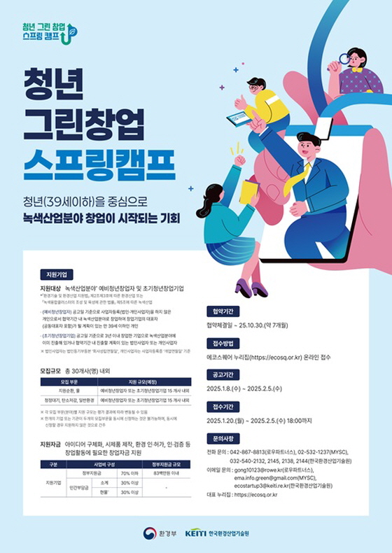 2025년도 청년그린창업 스프링캠프 (예비청년창업자, 초기청년창업기업 모집공고) 공모분야 기타분야 접수기간2025.01.20 ~ 2025.02.05 D+368 종료 참가자격 기타 제한 주최환경부 주관한국환경산업기술원 1등상금(상품)기타 홈페이지 바로가기 첨부파일 다운로드 유의사항 ※본 내용은 참고 자료로 내용의 오류와 변동에 대해 책임지지 않습니다. (오류 및 변동 신고는 상단의 '제안/오류' 신고를 통해 해주십시오.) ※주최사 사정에 따라 일정 및 내용이 변경될 수 있으니 주최사 홈페이지 등을 통해 관련 안내를 수시로 확인하시기 바랍니다. 상세내용 녹색산업분야 혁신적인 창업 아이템을 보유한 청년 스타트업을 발굴‧지원하고자 『2025년도 청년그린창업 스프링캠프』를 다음과 같이 공고합니다. □ 목적◦ 녹색산업 유망 창업아이템을 보유한 청년 (예비)초기창업기업을 대상으로 창업‧성장 지원 □ 대상 : 녹색산업분야* 예비청년창업자, 초기청년창업기업* (정의) 「환경기술 및 환경산업 지원법」 제2조제3호에 따른 환경산업 또는 「녹색융합클러스터의 조성 및 육성에 관한 법률」 제5조에 따른 녹색산업(덧붙임 12 참조)※ 한국환경산업협회(www.keia.kr)에서 추진 중인 “업사이클(새활용) 분야”는 제외 ◦ (예비청년창업자) 공고일 기준으로 사업자등록(법인·개인사업자)을 하지 않은 개인으로서 협약기간(협약체결일~'25.10월 예정) 내 녹색산업분야로 창업하여 창업기업의 대표자(공동대표자 포함)가 될 계획이 있는 만 39세 이하인 개인◦ (초기청년창업기업) 공고일 기준으로 3년 이내 창업(’22.1.8~‘25.1.8)한 기업으로 녹색산업분야에 이미 진출해 있거나 협약기간(협약체결일~‘25.10월 예정) 내 진출할 계획이 있는 법인사업자 또는 개인사업자※ 법인사업자는 법인등기부등본 ‘회사성립연월일’, 개인사업자는 사업자등록증 ‘개업연월일’ 기준 □ 모집규모 : 총 30개사(명) 내외◦ 자원순환 또는 물 : 예비청년창업자 또는 초기청년창업기업 15 개사 내외◦ 청정대기 또는 탄소저감 또는 일반환경 : 예비청년창업자 또는 초기청년창업기업 15 개사 내외 * 각 지원 규모는 평가 결과에 따라 변동될 수 있음* 한개의 기업이 두개의 모집부분을 동시에 신청하는 것은 불가능하며, 동시에 신청할 경우 지원하지 않은 것으로 간주* 예비청년창업자:공고일 기준으로 만 39세 이하인 예비창업자(협약기간내 창업 의무 부여)* 초기청년창업기업:공고일 기준으로 만 39세 이하가 대표자(공동대표자 포함)인 초기창업기업(3년 이내)1) 예비청년창업자 일반 : ① 창업이력이 없는 사람, ② 이종 기업을 폐업한 사람, ③ 동종 기업을 폐업한 후 3년 이상 경과한 사람 □ 협약기간 : 협약체결일 ~ ‘24.10.30(약 7개월간) □ 지원내용 : 창업자금 및 역량강화 프로그램 - (창업자금) 아이디어 구체화, 시제품 제작, 환경인허가 등에 필요한 창업자금 83백만원 내외 - (역량강화 프로그램) 모집부문 별 운영사에서 제공하는 교육, 컨설팅, 투자유치 연계 등의 프로그램 ※ 운영기관 개요 및 역량강화 프로그램 지원내용은 덧붙임 9를 참고※ 지원기업이 동 사업에 선정될 경우, 전문기관 또는 운영기관이 지원하는 역량강화 프로그램에 성실하게 참여하여야 함 □ 접수기간 : 2025년 1월 20일(월) ∼ 2월 5일(수) 18:00까지 □ 접 수 처 : 에코스퀘어 누리집(https://ecosq.or.kr) □ 문의처◦ 전화 문의 : 042-867-8813(로우파트너스), 02-532-1237(MYSC) 032-540-2132, 2138, 2144(한국환경산업기술원) ◦ 이메일 문의 : gong10123@rowe.kr(로우파트너스), ema.info.green@gmail.com(MYSC) ecostartup3@keiti.re.kr(한국환경산업기술원) ◦ 대표 누리집 : https://ecosq.or.kr 목록