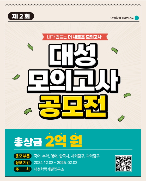 제2회 대성 모의고사 공모전 공모분야 기획/아이디어/마케팅, 기타분야 접수기간2024.12.02 ~ 2025.02.02 D+371 종료 참가자격 제한없음 주최대성학력개발연구소 1등상금(상품)1천만원 초과 홈페이지 바로가기 첨부파일 다운로드 유의사항 ※본 내용은 참고 자료로 내용의 오류와 변동에 대해 책임지지 않습니다. (오류 및 변동 신고는 상단의 '제안/오류' 신고를 통해 해주십시오.) ※주최사 사정에 따라 일정 및 내용이 변경될 수 있으니 주최사 홈페이지 등을 통해 관련 안내를 수시로 확인하시기 바랍니다. 상세내용 ■ 제목제2회 대성 모의고사 공모전 ■ 기간- 접수 : 2024년 12월 2일 ~ 2025년 2월 2일- 발표 : 2025년 3월 31일- 시상 : 2025년 4월 초 ■ 참가자격 제한없음- 단, 전 회차 대성 모의고사 공모전 수상자는 참가할 수 없음 ■ 참여방법 / 접수방법<공모 주제>- 내가 만드는 더 새로운 모의고사 <공모 분야>- 모의고사 : 국어,수학,영어,한국사,사회탐구,과학탐구 <제출 형식>- 국어(공통) : 독서,문학 중 택1 - 17문항- 국어(선택) : 화법과 작문, 언어와 매체 중 택1 - 11문항- 수학 : 공통+선택(확률과 통계, 미적분, 기하 중 택 1) - 30문항- 영어 : 읽기 부문 - 28문항- 한국사 : 수능 범위 - 20문항- 과학탐구 : 물리1/2, 화학1/2, 생명과학1/2, 지구과학1/2 - 20문항- 사회탐구 : 생활과윤리, 윤리와사상, 한국지리, 세계지리, 동아시아사, 세계사, 경제, 정치와 법, 사회문화 – 20문항 <접수 방법>- 지원서 작성 후 PDF 양식으로 저장- 파일명 예시 : 241225_국어_화법과_작문_홍길동- 지원서 이메일 접수 : dsdogongmo@gmail.com ■ 시상내용 / 혜택- 총 상금 2억원- 대상 : 2000만원 / 1명- 최우수상(수학부문) : 각 1500만원 / 최우수상 전체 최대 5명- 최우수상(이외부문) : 각 1200만원 / 최우수상 전체 최대 5명- 우수상(수학부문) : 각 1000만원 / 우수상 전체 최대 17명- 우수상(이외부문) : 각 600만원 / 우수상 전체 최대 17명 ■ 문의대성학력개발연구소 홈페이지 1:1 문의 목록
