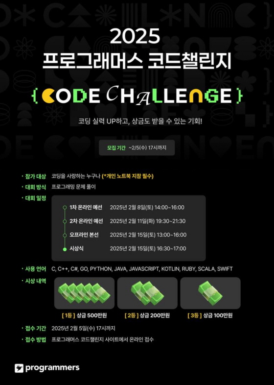 2025 프로그래머스 코드챌린지 공모분야 기타분야 접수기간2025.01.20 ~ 2025.02.05 D+368 종료 참가자격 제한없음 주최프로그래머스 1등상금(상품)500만원~1천만원 홈페이지 바로가기 첨부파일 다운로드 유의사항 ※본 내용은 참고 자료로 내용의 오류와 변동에 대해 책임지지 않습니다. (오류 및 변동 신고는 상단의 '제안/오류' 신고를 통해 해주십시오.) ※주최사 사정에 따라 일정 및 내용이 변경될 수 있으니 주최사 홈페이지 등을 통해 관련 안내를 수시로 확인하시기 바랍니다. 상세내용 ■ 제목2025 프로그래머스 코드챌린지 ■ 기간<참가 신청> 2월 5일 17시까지 온라인 접수 <온라인 예선>- 진행 날짜1차 02/08(토) 14시 - 16시2차 02/11(화) 19시 30분 - 21시 30분 - 운영 방식총 2회 진행되며 모두 참여해야 본선 진출 가능 - 본선 선발 기준다음과 같은 우선 순위에 따라 선발됩니다.1. 예선 1차, 2차 합산 점수가 높은 순2. 최고 점수 도달이 빠른 순3. 제출 횟수가 적은 순 - 출제 문항회차당 4문제 / 실제 코딩 테스트에사용되는 문제들과 유사한 난이도 <오프라인 본선>- 대상자예선 참가자 중 상위 50명 - 진행 날짜 : 02/15(토) 13시 - 16시 - 진행 장소프로그래머스 강남 강의장(서울 강남구 강남대로 388, 지하 2층) - 출제 문항4문제 / 온라인 예선에서 출제된 문제보다 더 높은 난이도의 문제 <시상식>진행 날짜 : 02/15(토) 16시 30분 - 17시 진행 장소 : 프로그래머스 강남 강의장(서울 강남구 강남대로 388, 지하 2층) ■ 참가자격- 내 실력을 확인하고 싶은 개발자- 자신의 한계를 시험해보고 싶은 개발자- 코딩을 사랑하는 누구나 ■ 참여방법 / 접수방법<공모 주제> - 프로그래머스 코딩테스트 환경을 직접 체험하고, 창의적이고 도전적인 문제를 풀어보며코딩 실력을 한 단계 끌어올릴 수 있는 기회를 잡아보세요! <사용 가능한 언어> - C, C++, C#, GO - PYTHON, JAVA, JAVASCRIPT, KOTLIN, RUBY, SCALA, SWIFT <접수 방법> - 프로그래머스 코드챌린지 대회페이지 접수 https://career.programmers.co.kr/competitions/4079 - 접수 지원 시 이름은 '국문 실명'으로 기재 부탁드립니다. - 이메일 주소 및 연락처를 정확히 입력해주세요. (입력하신 이메일 주소 및 연락처를 통해 안내 메시지가 발송됩니다.) ■ 시상내용 / 혜택 - 1등 : 상금 500만원 - 2등 : 상금 200만원 - 3등 : 상금 100만원 - 참가 혜택 : 모든 참가자에게 코딩역량인증시험 할인 쿠폰 증정 - 추첨 이벤트 : 에어팟(3명), 머쓱이 담요+스티커팩(100명) - 깜짝 특별상(예선 시험 종료 후 발표) : 키크론 기계식 키보드, 배달의민족 10만원권 쿠폰 ■ 문의 2025 프로그래머스 코드챌린지 채널톡 문의 [상담 운영 시간 : 평일 10:00~17:00 (점심시간 제외) 목록