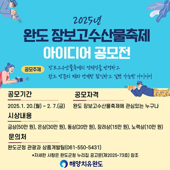 완도 장보고수산물축제 아이디어 공모전 공모분야 기획/아이디어/마케팅 접수기간2025.01.20 ~ 2025.02.07 D+366 종료 참가자격 제한없음 주최완두군 1등상금(상품)100만원 이하 홈페이지 바로가기 첨부파일 다운로드 유의사항 ※본 내용은 참고 자료로 내용의 오류와 변동에 대해 책임지지 않습니다. (오류 및 변동 신고는 상단의 '제안/오류' 신고를 통해 해주십시오.) ※주최사 사정에 따라 일정 및 내용이 변경될 수 있으니 주최사 홈페이지 등을 통해 관련 안내를 수시로 확인하시기 바랍니다. 상세내용 ■ 제목완도 장보고수산물축제 아이디어 공모전 ■ 개요완도군에서는 ‘치유의 섬, 완도 방문의 해’를 맞아 대표축제로서의 위상 및 관광객 만족도 제고를 위한 「완도 장보고수산물축제 아이디어 공모전」을 다음과 같이 개최하오니 많은 사람들의 참여 바랍니다. ■ 기간2025. 1. 20.(월)~2. 7.(금) ■ 참가자격‘완도군 장보고수산물축제에 관심있는’ 누구나 ■ 참여방법 / 접수방법<공모주제> 장보고수산물축제의 정체성을 반영하고 완도 방문의 해와 연계하여 참신하고 실현가능한 아이디어 체험 관련 누구나 참여할 수 있는 프로그램 지역 경제 활성화를 위한 판매, 전시 프로그램 기타 차별화를 통해 축제의 경쟁력 강화에 기여할 수 킬러콘텐츠 <응모방법> 응모방법: 방문, 우편, 전자우편 제출 - 방문: 완도군청 별관 2층 관관과 상품개발팀 - 우편: (우 59124) 전남 완도군·읍 청해진남로 51, 별관 2층 관광과 상품개발팀 ※ 우편은 접수 마감일 소인 분까지 유효 - 전자우편: kmj1364@korea.kr(서명 또는 날인 후 스캔본) 제출서류: ① 공모제안서, ② 개인정보활용 동의서 각 1부 ■ 시상내용 / 혜택 구 분금 상은 상동 상장 려 상노 력 상상 금50만원30만원20만원15만원10만원 ※ 평균점수 60점 미만일 경우 모두 선정하지 않을 수 있음 ※ 상장은 별도 지급되지 않음 ■ 유의사항❍ 1인(팀) 당 1건만 접수 가능합니다..❍ 제안자 인적사항, 세부제안 설명 등 신청서의 모든 내용은 필수 작성사항이며, 기재 내용이 허위일 경우 선정을 취소합니다.❍ 본인의 창작물이 아니거나 기타 부정한 방법에 의한 경우 심사대상에서 제외되며, 시상 후 위반사실이 발견될 시 시상금을 환수 조치합니다.❍ 심사과정 및 심사내용 등은 비공개로 하고, 심사내용에 대하여 응모자는 일체의 이의를 제기할 수 없습니다.❍ 동일한 내용으로 타 공모전에 응모하여 시상한 사실이 확인된 경우 입선을 취소하고 상금은 환수 조치합니다.❍ 우수 제안이 없을 경우 선정하지 않을 수 있습니다.❍ 심사에서 선정된 제안 또는 미 선정된 제안은 본인 동의 시 모두 해당 축제에 활용 또는 활용되지 않을 수 있습니다.❍ 제출된 제안서 및 관련 서류는 선정여부를 불문하고 반환하지 않으며, 선정된 제안에 대한 저작권 및 활용권을 포함한 모든 권리는 완도군에 귀속됩니다.❍ 동일 또는 유사한 내용으로 중복 응모한 제안은 접수순서가 우선하는 제안만을 심사 대상으로 상정합니다❍ 제안과 관련하여 제3자의 저작권, 초상권 침해 등 분쟁 발생 시 모든 책임은 응모자에게 있으며, 시상 이후 발견 시 시상금은 환수 조치됩니다.❍ 공고내용의 해석에 대한 사항은 완도군의 판단에 따라야 하며, 사정에 따라 진행일정 및 내용이 변경될 수 있습니다.❍ 상기 외의 사항에 대하여는 관련 법규가 정하는 바에 따릅니다.❍ 본 공모전에 참가신청서를 제출한 사람은 위의 모든 내용에 동의하는 것으로 간주합니다. ■ 문의완도군청 관광과 상품개발팀(☎061-550-5431) 목록