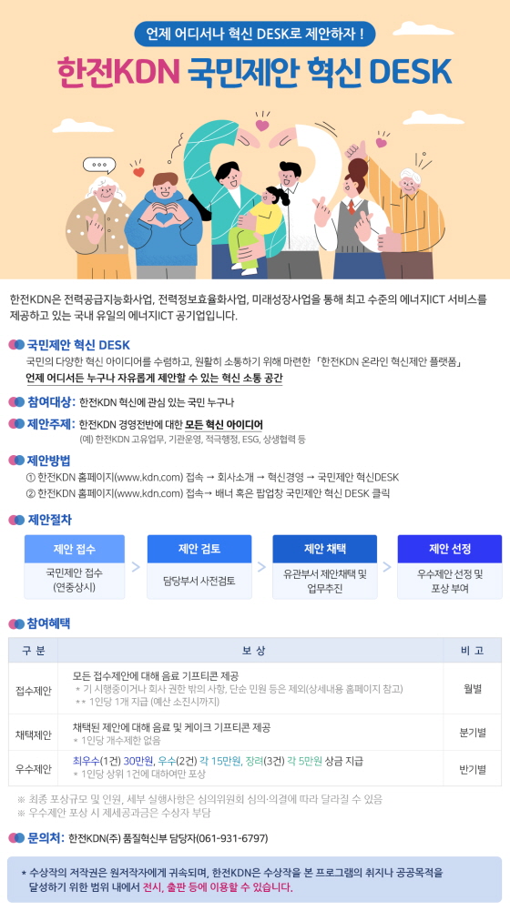 [한전 KDN] 국민제안 혁신 DESK 공모분야 기획/아이디어/마케팅 접수기간2025.01.01 ~ 2035.01.01 D-3250 접수중 참가자격 제한없음 주최(주) 한전KDN 1등상금(상품)100만원 이하 홈페이지 바로가기 첨부파일 다운로드 유의사항 ※본 내용은 참고 자료로 내용의 오류와 변동에 대해 책임지지 않습니다. (오류 및 변동 신고는 상단의 '제안/오류' 신고를 통해 해주십시오.) ※주최사 사정에 따라 일정 및 내용이 변경될 수 있으니 주최사 홈페이지 등을 통해 관련 안내를 수시로 확인하시기 바랍니다. 상세내용 ■ 제목[한전 KDN] 국민제안 혁신 DESK ■ 기간연중 상시 접수 ■ 참가자격제한없이 누구나 ■ 참여방법 / 접수방법<제안주제> 한전KDN 경영전반에 대한 모든 혁신 아이디어 (예시) 한전KDN 고유업무, 기관운영, 적극행정, ESG, 상생협력 등 <제안방법> 한전KDN 홈페이지( www.kdn.com)접속 1) 회사소개 → 혁신경영 → ‘국민제안 혁신DESK’ 2) 국민소통 → 고객의소리 → 국민제안 혁신DESK 3) 배너 혹은 팝업창 ‘국민제안 혁신DESK’ 클릭 ■ 시상내용 / 혜택<접수제안 : 월별>모든 접수된 제안에 대해 음료 기프티콘 지급 * 기 시행중이거나 단순 민원 등은 제외(상세내용 홈페이지 참고) ** 1인당 1개 지급(예산 소진시까지) <채택제안 : 분기별>채택된 제안에 대해 음료 및 케이크 기프티콘 지급 * 1인당 개수제한 없음 <우수제안 : 반기별>최우수(1건) 30만원, 우수(2건) 각 15만원, 장려(3건) 각 5만원상금 지급 * 1인당 상위 1건에 대하여만 포상 ■ 문의한전KDN(주) 기획처 품질혁신부 담당자 (Tel. 061-931-6797) 목록