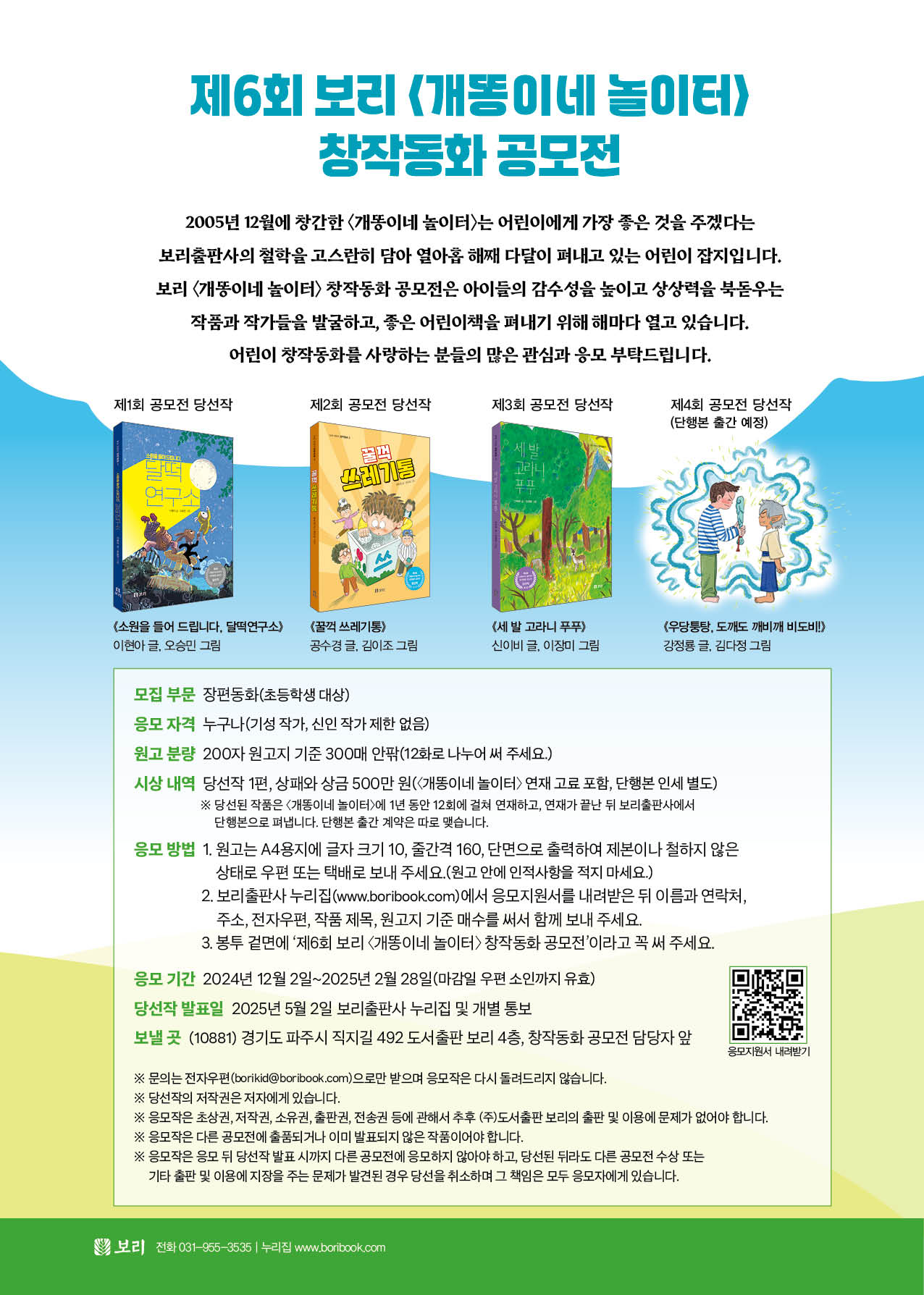 제6회 보리 창작동화 공모전 공모분야 문학/시나리오 접수기간2024.12.02 ~ 2025.02.28 D+344 종료 참가자격 제한없음 주최(주)도서출판 보리 1등상금(상품)500만원~1천만원 홈페이지 바로가기 첨부파일 다운로드 유의사항 ※본 내용은 참고 자료로 내용의 오류와 변동에 대해 책임지지 않습니다. (오류 및 변동 신고는 상단의 '제안/오류' 신고를 통해 해주십시오.) ※주최사 사정에 따라 일정 및 내용이 변경될 수 있으니 주최사 홈페이지 등을 통해 관련 안내를 수시로 확인하시기 바랍니다. 상세내용 ■ 제목제6회 보리 <개똥이네 놀이터> 창작동화 공모전 ■ 기간2024년 12월 2일~2025년 2월 28일(마감일 우편 소인까지 유효) - 당선작 발표일 2025년 5월 2일 보리출판사 누리집 및 개별 통보 ■ 참가자격누구나(기성 작가, 신인 작가 제한 없음) ■ 참여방법 / 접수방법- 모집 부문 장편동화(초등학생 대상) - 원고 분량 200자 원고지 기준 300매 안팎(12화로 나누어 써 주세요.) - 응모 방법 1. 원고는 A4용지에 글자 크기 10, 줄간격 160, 단면으로 출력하여 제본이나 철하지 않는 상태로 우편 또는 택배로 보내 주세요. (원고 안에 인적사항을 적지 마세요.) 2. 보리출판사 누리집(www.boribook.com)에서 응모지원서를 내려받은 뒤 이름과 연락처, 주소, 전자우편, 작품 제목, 원고지 기준 매수를 써서 함께 보내 주세요. 3. 봉투 겉면에 ‘제6회 보리 〈개똥이네 놀이터〉 창작동화 공모전’이라고 꼭 써 주세요. - 보낼 곳 (10881) 경기도 파주시 직지길 492 도서출판 보리 4층, 창작동화 공모전 담당자 앞 ■ 시상내용 / 혜택당선작 1편, 상패와 상금 500만 원(〈개똥이네 놀이터〉 연재 고료 포함, 단행본 인세 별도) ※ 당선된 작품은 〈개똥이네 놀이터〉에 1년 동안 12회에 걸쳐 연재하고, 연재가 끝난 뒤 보리출판사에서 단행본으로 펴냅니다. 단행본 출간 계약은 따로 맺습니다. ■ 유의사항※ 문의는 전자우편(borikid@boribook.com)으로만 받으며 응모작은 다시 돌려드리지 않습니다. ※ 당선작의 저작권은 저자에게 있습니다. ※ 응모작은 초상권, 저작권, 소유권, 출판권, 전송권 등에 관해서 추후 (주)도서출판 보리의 출판 및 이용에 문제가 없어야 합니다. ※ 응모작은 다른 공모전에 출품되거나 이미 발표되지 않은 작품이어야 합니다. ※ 응모작은 응모 뒤 당선작 발표 시까지 다른 공모전 응모를 하지 않아야 하고, 당선된 뒤라도 다른 공모전 수상 또는 기타 출판 및 이용에 지장을 주는 문제가 발견된 경우 당선을 취소하며 그 책임은 모두 응모자에게 있습니다. 목록