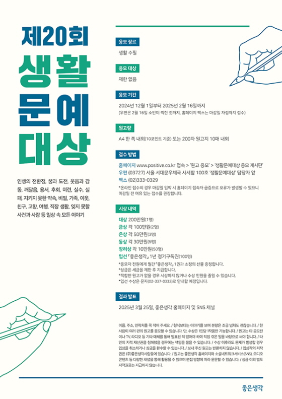 [좋은생각] 2025년 제20회 생활문예대상 공모분야 문학/시나리오 접수기간2024.12.01 ~ 2025.02.16 D+356 종료 참가자격 제한없음 주최(주)좋은생각사람들 1등상금(상품)200만원~499만원 홈페이지 바로가기 첨부파일 다운로드 유의사항 ※본 내용은 참고 자료로 내용의 오류와 변동에 대해 책임지지 않습니다. (오류 및 변동 신고는 상단의 '제안/오류' 신고를 통해 해주십시오.) ※주최사 사정에 따라 일정 및 내용이 변경될 수 있으니 주최사 홈페이지 등을 통해 관련 안내를 수시로 확인하시기 바랍니다. 상세내용 ■ 제목[좋은생각] 2025년 제20회 생활문예대상 ■ 개요인생의 전환점, 감동 에피소드, 꿈과 도전, 여행기, 이민 생활의 애환, 웃음, 깨달음을 준 일, 용서, 실패담, 연애담, 후회, 친구, 고향, 아름다운 선택, 직장에서 생긴 일, 반성문, 실수담, 탄생의 비밀, 좌충우돌 육아, 잊지 못할 사건과 사람 등 일상 생활 속 모든 이야기를 기다립니다. ■ 기간원고 마감일 : 2025년 2월 16일(일) - 우편은 2월 16일 소인이 찍힌 것까지, 홈페이지 및 팩스는 마감일 자정까지 접수 결과 발표 : 2025년 3월 25일, 좋은생각 홈페이지 및 SNS 채널 ■ 참가자격- 제한 없음 ■ 참여방법 / 접수방법<공모 주제> - 인생의 전환점, 꿈과 도전, 웃음과 감동, 깨달음, 용서, 후회, 실수담, 실패담, 연애담, 가족, 이웃, 우정, 고향, 여행기, 이민 생활의 애환, 일터에서 겪은 일, 비밀, 잊지 못할 사건과 사람 등 일상생활 속 모든 이야기 <원고량>200자 원고지 10매(한글 파일에서 작성할 경우 10포인트로 한쪽 내외) ■ 시상내용 / 혜택- 대상 200만 원(1명)- 금상 각 100만 원(2명)- 은상 각 50만 원(3명)- 동상 각 30만 원(5명)- 장려상 각 10만 원(50명)- 입선 「좋은생각」 1년 정기구독권(100명) * 응모자 전원에게 월간 「좋은생각」 1권과 소정의 선물을 증정합니다. * 적합한 원고가 없을 경우 시상하지 않거나 수상 인원을 줄일 수 있습니다. * 입선 수상은 문자(02-337-0332)로 안내할 예정입니다. ■ 유의사항- 이름, 주소, 연락처를 꼭 적어 주십시오.- 글씨체, 글씨 크기 등 형식보다 이야기를 봅니다. 분량은 조금 넘쳐도 괜찮습니다.- 원고는 다른 곳에 발표한 적 없어야 하며, 보내 주신 원고는 반환하지 않습니다.- 입상작은 게재를 거부할 수 없으며, 편집 방향에 따라 윤문할 수 있습니다.- 타인의 지적 재산권을 침해했을 시 책임을 물을 수 있으며 입상을 취소하거나 상금, 선물을 환수할 수 있습니다.- 입상작에 대한 저작 재산권은 ㈜좋은생각사람들에 있으며 원고는 좋은생각 해외판, 좋은생각 사이트, SNS, 애플리케이션, 오디오 콘텐츠에 활용될 수 있습니다. ■ 문의02-337-0332 목록