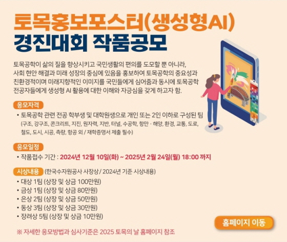 [대한토목학회] 토목홍보 포스터(생성형AI) 경진대회 공모분야 웹툰/포스터/미술, 건축 설계/건축디자인 접수기간2024.12.10 ~ 2025.02.24 D+348 종료 참가자격 대학(원)생/청년 주최(사)대한토목학회 1등상금(상품)100만원~199만원 홈페이지 바로가기 첨부파일 다운로드 유의사항 ※본 내용은 참고 자료로 내용의 오류와 변동에 대해 책임지지 않습니다. (오류 및 변동 신고는 상단의 '제안/오류' 신고를 통해 해주십시오.) ※주최사 사정에 따라 일정 및 내용이 변경될 수 있으니 주최사 홈페이지 등을 통해 관련 안내를 수시로 확인하시기 바랍니다. 상세내용 ■ 제목[대한토목학회] 토목홍보 포스터(생성형AI) 경진대회 ■ 개요토목공학이 삶의 질을 향상시키고 국민생활의 편의를 도모할 뿐 아니라, 사회 현안 해결과 미래 성장의 중심에 있음을 홍보하여 토목공학의 중요성과 친환경적이며 미래지향적인 이미지를 국민들에게 심어줌과 동시에 토목공학 전공자들에게 생성형 AI 활용에 대한 이해와 자긍심을 갖게 하고자 함 ■ 기간작품접수 기간 : 2024년 12월 10일(화) ~ 2025년 2월 24일(월) 18:00 까지 ■ 참가자격토목공학 관련 전공(구조, 강구조, 콘크리트, 지진, 원자력, 지반, 터널, 수공학, 항만 · 해양, 환경, 교통, 도로, 철도, 도시, 시공, 측량, 항공) 학부생 및 대학원생으로 개인 또는 2인 이하로 구성된 팀(재학증명서 제출 필수)응모일정 ■ 참여방법 / 접수방법 토목의 날 홈페이지 (http://civilday.ksce.or.kr)를 통해 온라인 참가신청/ 회원가입을 하지 않아도 작품제출 가능 <작품접수 방법> 대한토목학회 홈페이지를 통해 파일 제출 (우편 및 인편 제출 불가) <작품제출요령> 포스터 작품과 작품설명서(홈페이지에서 양식 다운로드), 재학증명서 제출 <작품제작 요령> (포스터, 작품설명서, 재학증명서를 압축파일로 제출, 파일명 : 작품명_소속학교_팀원이름.zip). - 포스터 작품과 제작 의도에 대한 작품설명서 함께 제출 - 포스터 작품 그림파일- 작품설명서(생성형 AI활용 상세내역 포함)- 재학증명서- 작품규격은 A3(29.7㎝×42㎝, 해상도 300dpi)- 포스터 작품은 그림파일(.psd 또는 .jpg)로만 제출- 포스터 형식은 따로 없으며 그림, 사진, 글자, 컴퓨터 그래픽 등으로 자유롭게 표현 ■ 시상내용 / 혜택대상 1점 (상장 및 상금 100만원) 금상 1점 (상장 및 상금 80만원)은상 2점 (상장 및 상금 50만원)동상 3점 (상장 및 상금 30만원) 장려상 5점 (상장 및 상금 10만원) ■ 유의사항수상작은 토목학회지 표지, 토목의 날 등 학회행사의 홍보자료로 활용될 예정임출품작의 저작권은 출품자에게 있으나, 모든 출품작들의 홍보 브로슈어나 도록 출판 사용권은 대한토목학회 측에 있음표절작 및 타 공모전에 제출되었거나 이미 수상경력이 있는 작품은 심사에서 제외되며, 수상 이후에 밝혀질 경우 즉시 수상이 취소됨응모작은 팀별 1개 작품에 한함응모작 중 적합한 작품이 없는 경우 수상작을 선정하지 않을 수 있으며, 시상 내역은 변경될 수 있음기타 자세한 내용은 추후 학회 홈페이지 "2025년 토목의 날 행사"에서 확인할 수 있음 ■ 문의대한토목학회 사무국(담당: 장현정 과장)전화 : 02-3400-4531, 이메일 : hjjang@ksce.or.kr 목록