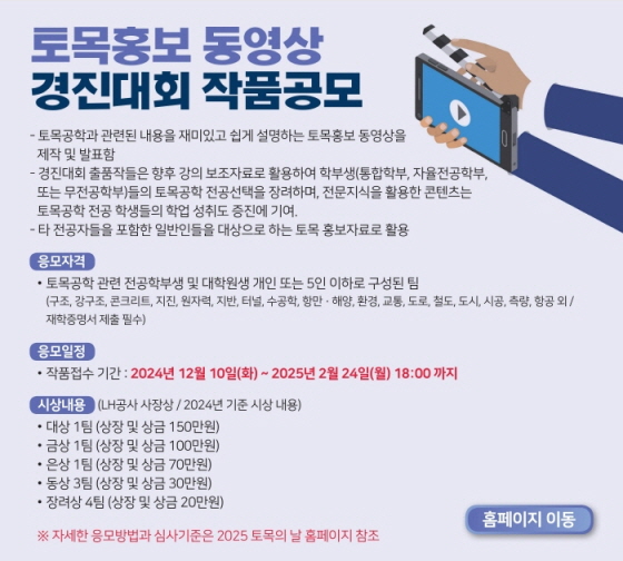 [대한토목학회] 토목홍보 동영상 경진대회 공모분야 사진/영상, 건축 설계/건축디자인 접수기간2024.12.10 ~ 2025.02.24 D+348 종료 참가자격 대학(원)생/청년 주최(사)대한토목학회 1등상금(상품)100만원~199만원 홈페이지 바로가기 첨부파일 다운로드 유의사항 ※본 내용은 참고 자료로 내용의 오류와 변동에 대해 책임지지 않습니다. (오류 및 변동 신고는 상단의 '제안/오류' 신고를 통해 해주십시오.) ※주최사 사정에 따라 일정 및 내용이 변경될 수 있으니 주최사 홈페이지 등을 통해 관련 안내를 수시로 확인하시기 바랍니다. 상세내용 ■ 제목[대한토목학회] 토목홍보 동영상 경진대회 ■ 개요 토목공학과 관련된 내용을 재미있고 쉽게 설명하는 토목홍보 동영상을 제작 및 발표함- 경진대회 출품작들은 향후 강의 보조자료로 활용하여 학부생(통합학부, 자율전공학부, 또는 무전공학부)들의 토목공학 전공선택을 장려하며, 전문지식을 활용한 콘텐츠는 토목공학 전공 학생들의 학업 성취도 증진에 기여.- 타 전공자들을 포함한 일반인들을 대상으로 하는 토목 홍보자료로 활용 예) 토목의아치구조 <이게 왜 안 무너지는지 알아?> 시멘트가 없는 콘크리트가 있다? - 무시멘트 머드축제? NO! 이제는 보령해저터널! 범인은 바로! (골)쟤...! 기후변화에 대응하기 위한 토목공학의 미래상은 무엇인가? 해수욕장의 불청객, 이안류는 왜 위험한가? 인공지능 토목공학에 이렇게 쓰인다. ■ 기간작품접수 기간 : 2024년 12월 10일(화) ~ 2025년 2월 24일(월) 18:00 까지 ■ 참가자격토목공학 관련 전공(구조, 강구조, 콘크리트, 지진, 원자력, 지반, 터널, 수공학, 항만 · 해양, 환경, 교통, 도로, 철도, 도시, 시공, 측량, 항공) 학부생 및 대학원생 개인 또는 5인 이하로 구성된 팀 (재학증명서 제출 필수) ■ 참여방법 / 접수방법<신청 방법> 토목의 날 홈페이지 (http://civilday.ksce.or.kr)를 통해 온라인 참가신청 <작품접수 방법> 대한토목학회 홈페이지를 통해 파일 제출 (우편 및 인편 제출 불가) / 회원가입을 하지 않아도 제출 가능 <작품제출 요령> 토목홍보 동영상 작품과 제작 의도에 대한 작품설명서(A4 1쪽 이내), 재학증명서, 출품서약서를 함께 제출 (제출 양식은 공식 홈페이지 공지글에서 다운로드) <작품제작 요령>원본 작품제작은 동영상의 품질유지를 위해 초당 30프레임 이상, 해상도는 1080픽셀x1920픽셀(스마트폰 영상 기준), 파일형식은 avi 또는 mp4로 함러닝타임 : 쇼츠(shorts) 형식 - 최소 30초 이상, 최대 1분 이하학회 홈페이지에 업로드된 심사파일은 유투브 대한토목학회 채널에 게시하여 일반인이 열람이 가능하도록 할 예정임콘텐츠 주제는 토목공학과 관련된 일반상식부터 전문지식까지 모든 내용을 범위로 포함하며, 동영상 제작에 그림, 컴퓨터그래픽, AI, 컴퓨터 프로그램 등 다양한 소재를 자유롭게 활용할 수 있음일반인들도 쉽게 재미있게 이해할 수 있는 창의적 아이디어가 돋보이는 단편 작품 형식으로 제작 ■ 시상내용 / 혜택대상 1팀 (상장 및 상금 150만원) 금상 1팀 (상장 및 상금 100만원)은상 1팀 (상장 및 상금 70만원)동상 3팀 (상장 및 상금 30만원) 장려상 4팀 (상장 및 상금 20만원) ■ 유의사항수상작과 수상자는 행사 후 학회 홈페이지 및 유튜브 대한토목학회 채널(https://www.youtube.com/1951ksce)에 게시함출품작의 저작권은 출품자에게 있으나, 모든 출품작들을 토목공학의 홍보나 교육용 자료로 사용할 수 있는 사용권은 대한토목학회 측에 있음동영상 제작에 사용한 모든 소재에 대한 출처를 명확히 밝혀야 함. 특히, 생성형 인공지능의 도움을 받아 제작된 경우, 반드시 사용한 모델과 검색 키워드를 밝혀 재현성을 입증해야 함. 이를 위반하는 경우 심사에서 제외되며, 수상 이후 밝혀지는 경우 즉시 수상이 취소됨. 표절작 및 타 공모전에 제출되었거나 이미 수상경력이 있는 작품 또는 기존에 제작된 기업홍보용 자료나 심의, 평가 등을 위해 제작된 동영상, 컴퓨터 그래픽 등의 일부를 재사용하는 경우는 심사에서 제외되며, 수상 이후에 밝혀질 경우 즉시 수상이 취소됨은 물론 모든 책임은 토목홍보 동영상 제작자 측에 있음.응모작은 팀별 1개 작품으로 제한함. 응모작 중 적합한 작품이 없는 경우 수상작을 선정하지 않을 수 있으며, 시상 내역은 변경될 수 있음.기타 자세한 내용은 추후 학회 홈페이지 "2025년 토목의 날 행사"에서 확인할 수 있음. ■ 문의대한토목학회 사무국(담당: 전수민 사원)전화 : 02-3400-4510, 이메일 : smjeon@ksce.or.kr 목록
