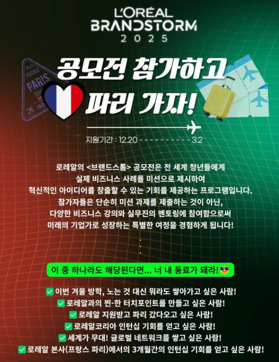 로레알 2025 브랜드스톰 공모전 공모분야 기획/아이디어/마케팅, 기타분야 접수기간2024.12.20 ~ 2025.03.02 D+341 종료 참가자격 대학(원)생/청년 주최로레알코리아 1등상금(상품)기타 홈페이지 바로가기 첨부파일 다운로드 유의사항 ※본 내용은 참고 자료로 내용의 오류와 변동에 대해 책임지지 않습니다. (오류 및 변동 신고는 상단의 '제안/오류' 신고를 통해 해주십시오.) ※주최사 사정에 따라 일정 및 내용이 변경될 수 있으니 주최사 홈페이지 등을 통해 관련 안내를 수시로 확인하시기 바랍니다. 상세내용 ■ 제목로레알2025 브랜드스톰 공모전 ■ 기간 - 지원 기간 : 2024. 12. 20 (금) ~ 2025. 03. 02 (일) 23:59 - 국내 준결승 : 4월 1일 - 국내 결승 : 4월 30일 - 국제 대회 : 2025년 6월 12 - 13일 * 상기 일정 및 진행방식 (온/오프라인)은 당사 사정 및 국제정세에 따라 변동될 수 있습니다. ■ 참가자격- 18~30세 이하 청년 (재학생, 휴학생, 졸업생 포함)- 3명이 한 팀을 이루어 미션 진행 * 1차 미션 과제물 제출 이후 팀원 변경 불가 * 외국인은 국내 대학교에 재학중인 경우에만 참여 가능 * 지원 시점 및 국내 대회 일정 동안 한국에서 수학/거주하는 경우에만 참여 가능 * 참가제한 : 과거 브랜드스톰에 참가하여 국제 파이널을 경험한 참가자 or 최근 2년내에 로레알 인턴십을 이수한 참가자 (Official Rules 파일 pg.1 참고) ■ 참여방법 / 접수방법<활동 내용> 1. 브랜드스톰 공식 홈페이지에서 사전등록하기 * 사전등록자 전원 브랜드스톰 계절학기 수강권 획득! * 1/13일(월) 오후 2시에 브랜드스톰 라이브 설명회 듣고 꿀팁 얻어가세요! 2. 3인 1팀 꾸리기 * 꿀팁! 성별 다양성을 갖춘 팀을 만들어보세요! 3. 돈 안내고 듣는 브랜드스톰 계절학기! - 사옥 초청 오피스 투어 - 2025 주제 & CPD 사업부 파헤치기 - 직무 (IT, DATA, 마케팅 등) 기초 강의 - 비즈니스 스킬 Up 강의 (AI, PPT 등) - 2024 우승팀과의 Q&A 세션 * 사전 등록자 대상 1월 중, 계절학기 신청 메일 발송 예정 * 오프라인 계절학기 신청 마감 : 1/22 * 온라인 계절학기 신청 마감 : 1/30 4. 미션 제출 (3분 팀 소개 영상 & 아이디어 슬라이드 3장) * 제출팀 전원에게 참가 증명서 발급 예정 5. 1차 전형 합격 팀 대상 국내 준결승 6. 국내 결승 및 국내 챔피언 선정 7. 국내 결승 우승팀은 국제대회 진출 in 프랑스 파리 & 로레알코리아 인턴십 입사 <공모 주제> - 기술 남성 뷰티 & 케어 아이디어를 제안해주세요. (MEN. BEAUTY & CARE. GAME ON) - 기술, 제품, 그 이상의 혁신 (Tech, Products and Beyond)을 통해 자유로운 아이디어를 제안해주세요. <접수 방법> - Brandstorm.loreal.com 공식 홈페이지로 접속하여 사전등록 * Participating Country : South Korea 선택 - Brandstorm 계절학기 열심히 수강하고, 미션 제출 시에는 3분 팀 소개 영상 (MP4) & 3장의 아이디어 슬라이드(PPT 또는 PDF)업로드 필요! * 3분 팀 소개 영상 : 로레알이 묻는 5개의 질문에 답변하는 영상을 제출해주세요! (질문과 규칙은 RULES – pg.2 – 4. DELIVERABLES REQUIREMENTS를 확인해주세요.) * 참가에 앞서 공식 홈페이지의 “MISSION” 및 “RULES”를 반드시 확인하시길 바랍니다. ■ 시상내용 / 혜택 1. 국제대회 우승팀: * 프랑스 본사에서 3개월간의 인턴십 참여 및 로레알 소속 직원으로서 멘토링을 받으며 프로젝트를 실현할 수 있는 기회 부여 2. 국내 결승 우승팀 (1등): * 2025 하반기 로레알코리아 인턴십 기회 부여 & 프랑스 파리에서 진행하는 국제대회에 한국대표로 참여 (대회 참여를 위한 항공권, 숙박비 일체 지원) * 수상자 공식 인터뷰 및 보도자료 발행 3. 국내 결승 준우승팀 (2,3등): * 2025 하반기 로레알코리아 인턴십 1차 서류전형 면제 4. 국내 결승 참가팀 전원: * 로레알코리아 공인 참가인증서 * 30만원 상당의 자사 제품 * 로레알코리아 Talent Pool로 관리 ■ 문의공식홈페이지 [FORUM] 페이지로 문의 목록