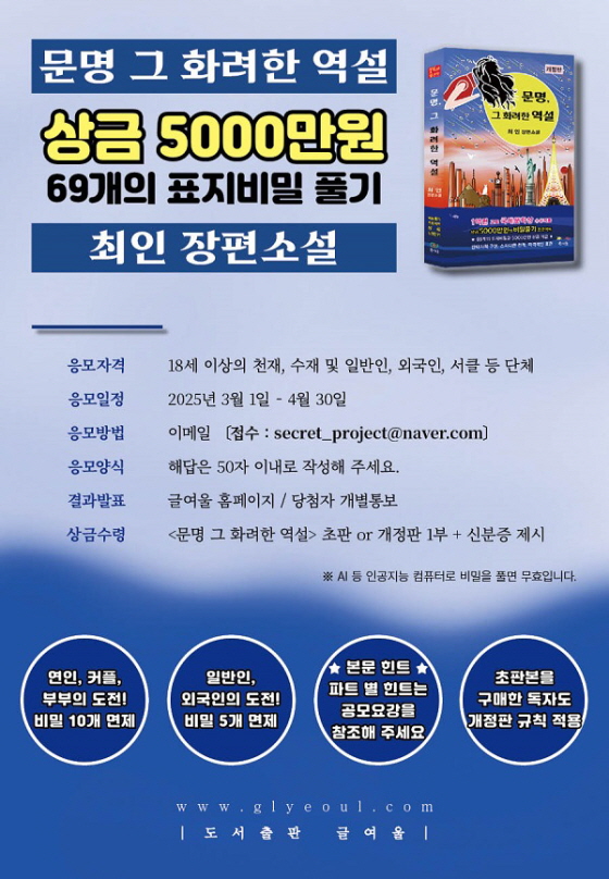 69개의 표지 비밀풀기 프로젝트 - 상금 5000만 원 공모분야 기획/아이디어/마케팅, 문학/시나리오, 기타분야 접수기간2025.03.01 ~ 2025.04.30 D+282 종료 참가자격 제한없음 주최도서출판 글여울 1등상금(상품)1천만원 초과 홈페이지 바로가기 첨부파일 다운로드 유의사항 ※본 내용은 참고 자료로 내용의 오류와 변동에 대해 책임지지 않습니다. (오류 및 변동 신고는 상단의 '제안/오류' 신고를 통해 해주십시오.) ※주최사 사정에 따라 일정 및 내용이 변경될 수 있으니 주최사 홈페이지 등을 통해 관련 안내를 수시로 확인하시기 바랍니다. 상세내용 ■ 제목(상금 5,000만원) 69개의 표지 비밀풀기 프로젝트 ■ 개요제36회 <문명 그 화려한 역설(저자, 최인)> 69개의 표지비밀 풀기 프로젝트 공모 1) 1억원 고료 국제문학상 수상작품2) 물신화 시대의 천재들에게 던지는 서제스쳔 3) 《문명 그 화려한 역설》은 새뮤얼 헌팅턴의 《문명의 충돌》, 제레드 다이아몬드의 《문명의 붕괴》와 함께 ‘문명의 3부작’으로 볼 수 있다.본 비밀풀기 프로젝트는 독서 시장에서 멀어지는 독자들을 붙잡기 위해 기획되고 추진된 새로운 텍스트이자 창의적 콘텐츠입니다. 도서출판 글여울은 고답스런 출판문화와 편중된 독서 시장의 정치된 패러다임의 외투를 과감히 벗기고자 합니다. 독자님들께서 본 비밀풀기 프로젝트에 참여하여 기발하고 유쾌한, 새로운 패러다임의 독서를 경험하시길 기대합니다.“재미있게 소설을 읽고 덤으로 비밀을 풀어 보세요!”* 비밀풀기에 도전하시는 독자는 서로 정보를 교환할 수 있습니다.* 초판본 구매 독자도 개정판의 규칙을 적용해 비밀을 풀 수 있습니다.* 연인, 커플, 부부가 도전할 경우 비밀 7개를 면제해 드립니다. ■ 기간2025년 3월 1일 ~ 4월 30일 ■ 참가자격18세 이상의 천재 및 일반인, 단체 등 ■ 참여방법 / 접수방법<일정>책을 소장하신 독자님은1월~2월 말/ 3월~4월 말 / 5월~6월 말 / 7월~8월 말 / 9월~10월 말 / 11월~12월 말1년에 6회, 5년에 30회 응모 가능합니다. <응모>책《문명, 그 화려한 역설》을 읽고 표지에 숨겨진 69개의 비밀을 풀어 이메일 응모합니다.◆ secret_project@naver.com <규격>해답은 10 ~ 50자 이내로 작성해 주세요.해답 마다 각각의 번호를 붙여 주세요. <비밀의 보관 및 개봉>비밀은 현재 봉인된 상태로 금고에 보관 중입니다.비밀의 개봉은 비밀이 풀렸을 때 이루어집니다.심사는 봉인된 비밀의 사본으로 실시합니다. <심사>2개월에 한 번 3일간 실시해 결과를 글여울 홈페이지에 게시합니다.* 당첨자 개별통보<힌트>파트 속 12개의 문제는 표지와 연계되어 있습니다.<1파트> 1개 / <13파트> 1개 / <17파트> 1개 / <25파트> 1개 / <34파트> 1개 / <40파트> 1개 / <49파트> 1개 / <50파트> 1개 / <62파트> 2개 / <68파트> 1개 / <소설 속 주요인물 중> 1개 ※ 연인, 커플, 부부가 도전할 경우 비밀 10개를 면제해 드립니다. ※ 일반인, 외국인이 도전할 경우 비밀 5개를 면제해 드립니다. ■ 시상내용 / 혜택 - 상금 5,000만원 - 상금 수령 시 《문명 , 그 화려한 역설》 개정판 또는 초판 1부와 신분증을 제시해야 합니다. ■ 문의- 이메일 oxsh_chu@naver.com- 홈페이지 www.glyeoul.com- 전화번호 070-8704-0829 목록