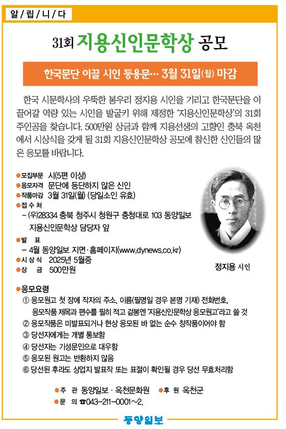 31회 지용신인문학상 공모 공모분야 문학/시나리오 접수기간2025.01.08 ~ 2025.03.31 D+311 종료 참가자격 제한없음 주최동양일보 주관동양일보, 옥천문화원 후원/협찬옥천군 1등상금(상품)500만원~1천만원 홈페이지 바로가기 첨부파일 다운로드 유의사항 ※본 내용은 참고 자료로 내용의 오류와 변동에 대해 책임지지 않습니다. (오류 및 변동 신고는 상단의 '제안/오류' 신고를 통해 해주십시오.) ※주최사 사정에 따라 일정 및 내용이 변경될 수 있으니 주최사 홈페이지 등을 통해 관련 안내를 수시로 확인하시기 바랍니다. 상세내용 ■ 제목31회 지용신인문학상 공모 ■ 기간~ 2025년 3월 31일(월) 까지 (당일 소인 유효) - 발표 예정 : 2025년 4월 동양일보 지면 및 홈페이지 ■ 참가자격문단에 등단하지 않은 신인 ■ 참여방법 / 접수방법시 (5편 이상) <접수처> - (우)28334 충북 청주시 청원구 충청대로 103. 동양일보 ‘지영신인문학상 담당자’ 앞 ■ 시상내용 / 혜택상금 500만원 ■ 유의사항 - 응모원고 첫 장에 작자의 주소, 이름(필명일 경우 본명 기재), 전화번호, 응모작품 제목과 편수를 필히 적고, 겉봉에 ‘지영신인문학상 응모원고’라고 쓸 것 - 응모작품은 미발표되거나 현상 응모된 바 없는 순수 창작품이어야 함 - 당선자는 기성문인으로 대우함 - 응모된 원고는 반환하지 않음 ■ 문의043-211-0001~2 목록
