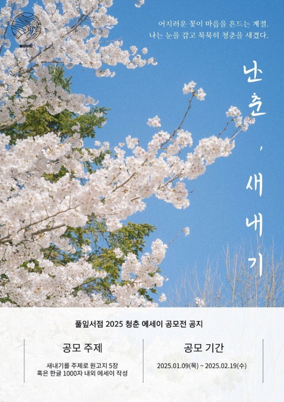 2025년 청춘 에세이 공모전 공모분야 문학/시나리오 접수기간2025.01.09 ~ 2025.02.19 D+351 종료 참가자격 기타 제한 주최독립출판사 풀잎서점 1등상금(상품)100만원 이하 홈페이지 바로가기 첨부파일 다운로드 유의사항 ※본 내용은 참고 자료로 내용의 오류와 변동에 대해 책임지지 않습니다. (오류 및 변동 신고는 상단의 '제안/오류' 신고를 통해 해주십시오.) ※주최사 사정에 따라 일정 및 내용이 변경될 수 있으니 주최사 홈페이지 등을 통해 관련 안내를 수시로 확인하시기 바랍니다. 상세내용 ■ 제목2025년 청춘 에세이 <새내기> 공모전 ■ 기간 - 2025.01.09(목)~2025.02.19(수) * 합격자 발표: 2025.03.01(토) ■ 참가자격대학 입학 예정자 및 사회 초년생 누구나 참여 가능 ■ 참여방법 / 접수방법<공모 주제> - "대학 생활의 첫 경험" 또는 "사회 초년생으로서의 도전"에 대한 솔직한 이야기를 담아주세요. - 제출된 에세이는 E북으로 출간 예정입니다. <제출 방법> - 제출 파일: 한글파일로 작성한 에세이, 1000자 내외 작성 - 작성 후 구글폼으로 제출 (파일 형식: .hwp 또는 .hwpx) - 파일 제목은 2025년_새내기_(성함)_(나이) - 예시) 2025년_새내기_홍길동_24 - https://forms.gle/kpTQQHxzrziHEbCK7 ■ 시상내용 / 혜택- 대상(1명): 상금 50만원 및 E북에 수록 (홍보 지원 포함)- 금상(1명): 상금 20만원 및 풀잎서점 굿즈- 은상(1명): 상금 10만원 ■ 문의 - 문의 이메일: pulipbook00@gmail.com - 심사결과 : https://pulip.framer.website/ (모바일로 확인 가능) 목록