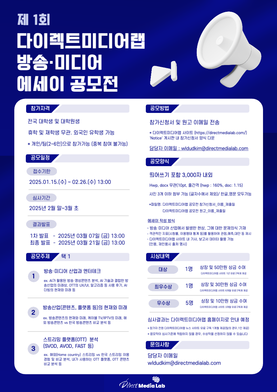 제 1회 다이렉트미디어랩 방송·미디어 에세이 공모전 공모분야 문학/시나리오 접수기간2025.01.15 ~ 2025.02.26 D+344 종료 참가자격 대학(원)생/청년 주최다이렉트미디어랩 1등상금(상품)100만원 이하 홈페이지 바로가기 첨부파일 다운로드 유의사항 ※본 내용은 참고 자료로 내용의 오류와 변동에 대해 책임지지 않습니다. (오류 및 변동 신고는 상단의 '제안/오류' 신고를 통해 해주십시오.) ※주최사 사정에 따라 일정 및 내용이 변경될 수 있으니 주최사 홈페이지 등을 통해 관련 안내를 수시로 확인하시기 바랍니다. 상세내용 ■ 제목제 1회 다이렉트미디어랩 방송·미디어 에세이 공모전 ■ 기간- 접수기한 : 2025년 01월 15일 (수) ~ 02월 26일 (수) 13:00 - 심사기간 : 2025년 2월 말 ~3월 초- 1차 결과 발표 : 2025년 03월 07일 (금) 13:00- 최종 결과 발표 : 2025년 03월 21일 (금) 13:00 ■ 참가자격- 전국 대학생 및 대학원생 (휴학 및 재학생 무관, 외국인 유학생 가능)- 개인/팀(2~6인)으로 참가가능 (중복 참여 불가능) ■ 참여방법 / 접수방법<공모주제 (택 1)>1. 방송·미디어 산업과 엔터테크ex. AI가 활용된 방송·영상콘텐츠 분석, AI 기술과 결합한 방송산업의 미래상, OTT의 UX/UI, 알고리즘 등 사용 후기, AI 더빙의 현재와 미래 등 2. 방송산업(콘텐츠, 플랫폼 등)의 현재와 미래ex. 방송콘텐츠의 현재와 미래, 케이블 TV/IPTV의 미래, 해외 방송콘텐츠 vs 한국 방송콘텐츠 비교 분석 등 3. 스트리밍(OTT) 분석 (SVOD, AVOD, FAST 등)ex. 해외(Home country) 스트리밍 vs 한국 스트리밍 이용 경험 및 비교 분석, 내가 사용하는 OTT 플랫폼, 광고 요금제 사용 경험, OTT 콘텐츠 비교 분석 등 <에세이 작성 방식>- 방송·미디어 산업에서 발생한 현상, 그에 대한 문제의식 기재- 객관적인 지표(시청률, 이용행태 통계 등)를 활용하여 관점, 예측, 대안 등 제시다이렉트미디어랩 사이트 내 기사, 보고서 데이터 활용 가능 (인용, 재인용시 출처 명시) <공모방법>- 참가신청서 및 원고를 담당자 이메일로 전송- 담당자 이메일 : wldudkim@directmedialab.com, cs@directmedialab.com- 다이렉트미디어랩 사이트 (https://directmedialab.com/) 'Notice' 게시판 내 참가신청서 양식 다운- 팀의 경우, 팀장 1인 제출 (성명, 연락처, 생년월일, 이메일 - 팀장 기재/ 소속 - 팀원 모두 기재 (이름포함) <공모양식>- 띄어쓰기 포함 3,000자 내외- Hwp, docx 무관(10pt, 줄간격 (hwp : 160%, doc: 1.15)- 사진 3개 이하 첨부 가능 (글자수에서 제외)/ 한글,영문 모두가능* 파일명: 다이렉트미디어랩 공모전 참가신청서_이름_제출일/ 다이렉트미디어랩 공모전 원고_이름_제출일 ■ 시상내용 / 혜택- 대상 : 1명 (상장 및 50만원 상금 수여/ 다이렉트미디어랩 사이트 1년 유료구독제 제공)- 최우수상 : 1명 (상장 및 30만원 상금 수여/ 다이렉트미디어랩 사이트 6개월 유료구독제 제공)- 우수상 : 5명 (상장 및 10만원 상금 수여/ 다이렉트미디어랩 사이트 3개월 유료구독제 제공)* 참가자 전원 다이렉트미디어랩 뉴스 사이트 유료 구독 1개월 제공(팀의 경우, 1인 제공) - 심사결과는 다이렉트미디어랩 홈페이지로 안내 예정* 응모작이 심사기준에 적합하지 않을 경우, 수상작을 선정하지 않을 수 있습니다 ■ 유의사항- 제출작은 다이렉트미디어랩의 홍보 목적으로 활용될 수 있으며, 제출작 및 이를 가공한 형태에 대한 저작권은 다이렉트미디어랩에서 보유합니다.- 수상작은 다이렉트미디어랩 홈페이지에 게재되며, 다이렉트미디어랩의 뉴스레터에도 전송됩니다.타 기관 공모전 입상작은 응모할 수 없으며, 추후 해당사항이 밝혀지거나 표절로 판명나는 경우 입상 취소 조치되며, 모든 법적인 책임은 본인에게 있습니다.- 응모건수가 미달이거나 또는 응모작이 심사기준에 부합되지 않을 경우, 시상자가 선정되지 않을 수도 있습니다.- 제출한 신청서 및 작품은 반환되지 않습니다. ■ 문의김지영 연구원 E-mail wldudkim@directmedialab.com 목록