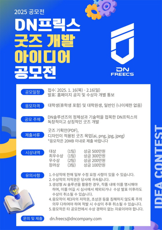 DN프릭스 굿즈 개발 아이디어 공모전 공모분야 기획/아이디어/마케팅, 디자인/캐릭터, 기타분야 접수기간2025.01.16 ~ 2025.02.16 D+354 종료 참가자격 제한없음 주최DN솔루션즈 1등상금(상품)500만원~1천만원 홈페이지 바로가기 첨부파일 다운로드 유의사항 ※본 내용은 참고 자료로 내용의 오류와 변동에 대해 책임지지 않습니다. (오류 및 변동 신고는 상단의 '제안/오류' 신고를 통해 해주십시오.) ※주최사 사정에 따라 일정 및 내용이 변경될 수 있으니 주최사 홈페이지 등을 통해 관련 안내를 수시로 확인하시기 바랍니다. 상세내용 ■ 제목DN프릭스 굿즈 개발 아이디어 공모전 ■ 기간 - 접수 일정 : 25년 1/16(목)~2/16(일) ■ 참가자격- 대학생(휴학생 포함) 및 대학원생- 일반인 (나이 제한 없음) ※ 개인 또는 팀 구성 최대 3명 ■ 참여방법 / 접수방법<공모 분야> ① 굿즈 ‘아이템’ 디자인 ② 굿즈 ‘캐릭터’ 디자인 <공모 주제> "DN솔루션즈의 정체성과 기술력을 접목한 DN프릭스의 독창적이고 상징적인 굿즈 개발" ① 굿즈 ‘아이템’ 디자인 - DN솔루션즈의 기술과 브랜드 아이덴티티를 반영한 ‘새로운 굿즈 물품’을 개발하는 것으로 단순히 기존에 존재하는 물품(텀블러, 키링, 등)에 로고만 적용하는 것이 아닙니다. 금속을 활용한 새로운 굿즈 물품을 개발하는 것입니다. ※ 예) DN프릭스 로고가 새겨진 금속 키링 ② 굿즈 ‘캐릭터’ 디자인 - 아이템에 적용될 수 있는 캐릭터 디자인하는 것입니다. ※ 단, 개발된 캐릭터 기반으로, 해당 캐릭터가 적용될 수 있는 굿즈 ‘아이템’ 1개 선정하여 목업 및 기획안 준비해야 합니다. ※ 해당 유형에는 기존에 존재하는 일상적인 아이템에 캐릭터만 적용하여도 됩니다. (예, 텀블러) ※ 위 두 가지를 합친 응모작도 가능합니다. (개발된 캐릭터가 적용된 새로운 아이템) 단, 별도의 가산점은 없습니다. <제출 형식> ① 굿즈 ‘아이템’ 디자인 (명시된 항목은 필수입니다) - 아이템명 - 아이템 설명: 아이템의 기본적인 설명(형태, 기능) - 디자인 컨셉: 디자인의 주요 요소(색상, 형태, 소재), 스토리텔링 - 기술적 및 브랜드 연결: 브랜드와 기술력을 어떻게 형상화 하는지 설명 - 목표 및 효과: 아이템이 브랜드 이미지 향상에 어떤 방식으로 기여할 수 있는지 설명, 전달하고자 하는 메시지가 무엇인지 ② 굿즈 ‘캐릭터’ 디자인 - 캐릭터명(이름) - 캐릭터 스토리텔링 (배경 및 특징): 캐릭터의 스토리(성격, 스타일, 분위기 등) 주요 특징 작성 - 기술적 및 브랜드 연결: 브랜드와 기술력을 어떻게 형상화 하는지 설명, 어떤 특징을 담아냈는지 설명 - 적용 아이템: 캐릭터가 적용될 굿즈 아이템 선정하여, 해당 아이템 선정 이유 설명 - 목표 및 효과: 캐릭터가 브랜드 이미지 향상에 어떤 방식으로 기여할 수 있는지, 전달하고자 하는 메시지가 무엇인지 ③ 공통사항 - DN프릭스 디자인 목업: 굿즈 형상화한 이미지 파일 (ai, png, jpeg, jpg 파일) - 굿즈 기획안 (PDF 파일) <접수 방법> - 이메일 접수(dn.freecs@dncompany.com) ※ 응모작은 20MB 내로 제출합니다. ■ 시상내용 / 혜택- 대상 (1팀): 500만원- 최우수상 (1팀): 300만원- 우수상 (2팀): 200만원- 장려상 (3팀): 100만원 ■ 유의사항- 수상작에 한해 일부 수정 요청 사항이 있을 수 있습니다.- 수상작의 저작권은 당사에 귀속됩니다.- 생성형 AI 솔루션을 활용한 경우, 작품 내에 이를 명시해야 하며, 이를 어길 시 심사에서 제외되거나 수상 발표 이후라도 수상이 취소될 수 있습니다.- 응모작이 제3자의 저작권, 초상권 등을 침해하지 않도록 주의 의무 다하여야 하며 모든 법적 분쟁 및 책임은 응모자에게 있으며 적발 시 수상이 추후 취소될 수 있습니다.- 응모작은 타 공모전에서 수상 경력이 없는 자료이어야 합니다. ■ 문의dn.freecs@dncompany.com 목록
