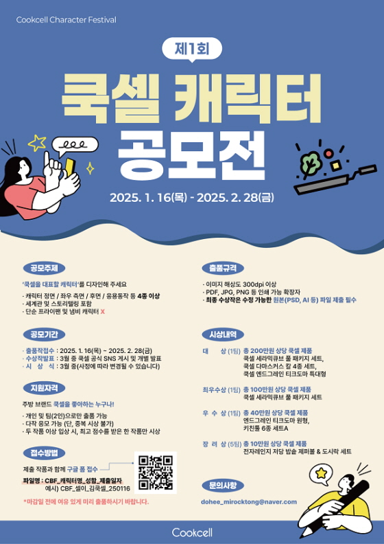 제 1회 쿡셀 캐릭터 공모전 공모분야 디자인/캐릭터 접수기간2025.01.15 ~ 2025.02.28 D+341 종료 참가자격 제한없음 주최(주) 블랙큐브 주관(주) 블랙큐브 1등상금(상품)기타 홈페이지 바로가기 첨부파일 다운로드 유의사항 ※본 내용은 참고 자료로 내용의 오류와 변동에 대해 책임지지 않습니다. (오류 및 변동 신고는 상단의 '제안/오류' 신고를 통해 해주십시오.) ※주최사 사정에 따라 일정 및 내용이 변경될 수 있으니 주최사 홈페이지 등을 통해 관련 안내를 수시로 확인하시기 바랍니다. 상세내용 ■ 제목제 1회 쿡셀 캐릭터 공모전 ■ 기간 - 출품작 접수 : 25.1.15 (월) ~ 25.02.28 (금) - 수상작 발표 : 3월 중 쿡셀 공식 SNS 게시 및 개별 발표 - 시상식 : 3월 중 진행 예정 (사정에 따라 변경될 수 있습니다.) ■ 참가자격주방 브랜드 쿡셀을 좋아하는 누구나! * 개인 및 팀(2인)으로만 출품 가능 * 다작 응모 가능하나, 중복 시상 불가 (최고득점을 받은 한 작품으로 시상) ■ 참여방법 / 접수방법<공모 주제> * 캐릭터 정면 / 좌우 측면 / 후면 / 응용동작 등 4종 이상 * 세계관 및 스토리텔링 포함 * 단순 후라이팬/냄비 캐릭터 지양 <제출 형식> * 이미지 해상도 300dpi 이상 * PDF, JPG, PNG 등 인쇄 가능 확장자 (최종 수상작은 수정 가능한 원본 (PSD, AI 등) 편집파일 제출 필수) <접수 방법> - 참가 신청서 작성 후, 제출 작품과 함께 https://forms.gle/McBs2fQPBeHZRUhx8 구글폼 접수 * 파일명: CBF_(캐릭터명)_이름_날짜 (ex. CBF_셀이_김쿡셀_250115) * 마감 일정 전, 여유 있게 미리 출품하시기 바랍니다. ■ 시상내용 / 혜택- 대상 : 총 1팀 (총 200만 원 상당) 쿡셀 세라믹큐브 풀 패키지 세트 (프라이팬 22cm & 28cm, 소테팬 28cm, 궁중팬 28cm, 계란말이팬 22cm, 떡볶이팬, 복합뚜껑 22cm & 28cm, 키친툴 6종 세트D) 쿡셀 다마스커스 칼세트 4종 (셰프 나이프, 산도쿠 나이프, 과도, 잼 나이프) 쿡셀 엔드그레인 티크도마 특대형 - 최우수상 : 총 1팀 (총 100만 원 상당) 쿡셀 세라믹큐브 풀 패키지 세트 (프라이팬 22cm & 28cm, 소테팬 28cm, 궁중팬 28cm, 계란말이팬 22cm, 떡볶이팬, 복합뚜껑 22cm & 28cm, 키친툴 6종 세트D) - 우수상 : 총 1팀 (총 40만 원 상당) 엔드그레인 티크도마 원형 키친툴 6종 세트 A - 장려상 : 총 5팀 (총 10만 원 상당) 전자레인지 저당밥솥 제퍼볼 ■ 유의사항 - 제출한 작품과 서류는 일체 반환되지 않으며 수상작의 모든 권한은 주최 측에 귀속됩니다. - 수상작은 주최 측에서 수정 및 보완해 사용할 수 있습니다. - 당첨된 유저의 수상을 위하여 개인 정보 수집에 동의하셔야 합니다. - 당선되신 분들께는 가입 계정 이메일로 결과가 개별 통보되며, 개인 정보 수집에 관련한 자세한 사항도 함께 공지됩니다. - 당선 이미지는 쿡셀 공식 SNS 계정에 노출됩니다. - 당선 이미지는 가공 후 쿡셀 공식 SNS 계정에 노출될 수 있습니다. - 생성 후 수정・보완한 이미지는 당선 후 이메일 제출 시 반드시 원본 파일을 함께 보내주셔야 합니다. - 다른 공모전의 출제작 도용 사실이 확인되면 수상이 취소될 수 있습니다. ■ 문의dohee_mirocktong@naver.com 목록