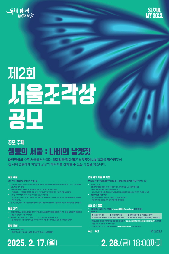 제2회 서울조각상 공모 공모분야 웹툰/포스터/미술, 디자인/캐릭터, 기타분야 접수기간2025.02.17 ~ 2025.02.28 D+341 종료 참가자격 기타 제한 주최서울시 1등상금(상품)기타 홈페이지 바로가기 첨부파일 다운로드 유의사항 ※본 내용은 참고 자료로 내용의 오류와 변동에 대해 책임지지 않습니다. (오류 및 변동 신고는 상단의 '제안/오류' 신고를 통해 해주십시오.) ※주최사 사정에 따라 일정 및 내용이 변경될 수 있으니 주최사 홈페이지 등을 통해 관련 안내를 수시로 확인하시기 바랍니다. 상세내용 ■ 제목제2회 서울조각상 공모 ■ 기간접수기간 : 2025. 2. 17.(월) ~ 2. 28.(금) 18:00 이메일 접수※기한 경과 후 접수 불가 ■ 참가자격- 조각(조형예술) 분야에서 활동 중인 만 19세 이상의 대한민국 국적의 작가 또는 국내 활동 중인 해외작가(개인 또는 팀) ※ 체류비 미지급 - (필수) 최근 3년 이내 조각 관련 개인전 또는 단체전 1회 이상 개최 경력※ 팀 구성은 최소 2명 이상이며 팀원 모두 위의 두 자격을 충족해야 함.(졸업전 및 학위청구전 제외) ■ 참여방법 / 접수방법<공모 주제 : 생동의 서울 : 나비의 날갯짓> - 대한민국의 수도 서울에서 느끼는 생동감을 담아 작은 날갯짓이 나비효과를 일으키듯이 전 세계 인류에게 희망과 긍정의 메시지를 전파할 수 있는 작품을 찾습니다 <공모 작품 : 공모 작가 1명(팀)당 야외 조각 작품 1점> - 야외 전시를 위한 작품으로 내구성을 갖춘 재료로 제작되어야 하며 분실과 파손 위험 또는 안전성 문제가 없는 작품이어야 함 - 야외 공원의 상시 개방성 및 안전상의 이유로 시각적 감상 위주 작품 ※ 인터렉티브ㆍ관객참여형 작품 응모 제한, 전시장 내 조명 및 관람 동선 안내 구조물 설치 예정 - (규모) 3×3×5(m) 이내 또는 이에 준하는 규모의 작품※ 작품 규모는 전시 현장 여건 등을 감안한 예시이며, 자유롭게 구상하되 입선작 선정 이후 예술감독과 협의하여 최종 조정 가능 - 공고일 현재, 국내․외 미발표된 작품으로 반드시 신작으로만 공모 가능(구작 또는 기제작된 작품 공모 불가) <제출서류> 아래 서류를 1개의 PDF 파일로 제출 1. 참가신청서 1부 2. 참가동의서 1부 3. 개인정보 수집 및 이용 동의서 1부 4. 작품기획서 1부(A4 가로형 규격, 10매 이내) 5. 포트폴리오 1부(A4 가로형 규격, 10매 이내)※ 제출서류의 파일명은 “2025서울조각상지원서제출_지원자(팀)명”으로 제출 (최대 용량 100MB 이하) <접수방법> 서울조각상 운영사무국 이메일 artseoul2025@gmail.com ■ 시상내용 / 혜택 - 입선자 15인(팀) : 입선자(15명) : 작품제작 지원금 2천5백만원(아티스트피 포함), 서울특별시장상 / 2025 서울조각페스티벌에 수상작 전시※ ’25년 전시 종료 이후 향후 3년간 서울시 주요 사업과 연계하여 우선적으로 전시할 수 있음 - 입선자 중 대상 1인(팀) : 노을조각공원 이동 설치(3년 내외), 서울특별시장(대상)※ 작품대여조건 등은 별도의 심사위원회를 통해 결정 ■ 유의사항◦ 작품은 반드시 신작으로만 응모해야 함. 단, 본 공모에 적합한 기존 작업물의 시리즈로서 신규 제작하는 경우 응모 가능◦ 응모자는 공모 요강 내 지원 자격, 수행기간 등을 반드시 숙지 후 신청◦ 제출서류 내 허위기재, 기재 착오, 구비서류 미제출 및 필수 내용 누락 또는 제출서류 양식 미준수 등으로 인한 불이익은 지원자 본인 책임으로, 지원서 접수 불가 및 심사에서 제외될 수 있음(접수 마감 이후 제출 서류 수정 및 추가 제출 불가)◦ 선정된 개인 및 팀은 주최측이 진행하는 각종 평가, 관람객 만족도 조사, 홍보물 제작 아카이빙 활용에 동의하여야 함◦ 모든 작품은 순수 창작물이어야 함. 심사 과정에서 표절 및 도용, 허위 사실 기재, 모방 또는 타인의 지식재산권ㆍ저작권ㆍ초상권 등 기타 일체의 권리를 침해하거나 타 공모전 수상 및 상품화된 작품인 사실이 밝혀질 경우, 그로 인한 모든 법적 책임은 응모자에게 있으며, 이 경우 심사 대상에서 제외되며, 최종 선정 이후에라도 선정을 취소하고 지원 혜택을 반환 요청할 수 있음◦ 시민 제보 등을 통해 부정행위 적발 시 해당 작품은 수상작에서 제외할 수 있음◦ 작품 제작 지원금 지급 관련하여 주최・주관기관은 개인정보보호법에 의거, 지원금 지급을 위하여 개인정보 수집・이용 동의를 요청할 수 있으며, 지원금은 세금 공제 후 지급됨◦ 응모를 위해 제출된 서류는 반환하지 않고 심사 후 파기◦ 심사, 선정, 발표 등 모든 일정은 주최 측의 사정에 따라 변경될 수 있음◦ 공모전에 관한 모든 변경 및 추가사항들은 서울시 홈페이지를 통해 공지할 예정으로 참가자가 확인하지 못해 발생한 불이익은 책임지지 않습니다. ■ 문의◦ 서울조각상 운영사무국 : 070-8806-5508 / 서울시 : 02-2133-4234 ※ 문의 가능 시간: 10:00-18:00 (점심시간 12:00-13:00 제외) ◦ 일정 변동 시 서울시 홈페이지를 통해 별도 공지합니다. - 서울시 홈페이지(고시, 공고): www.seoul.go.k 목록