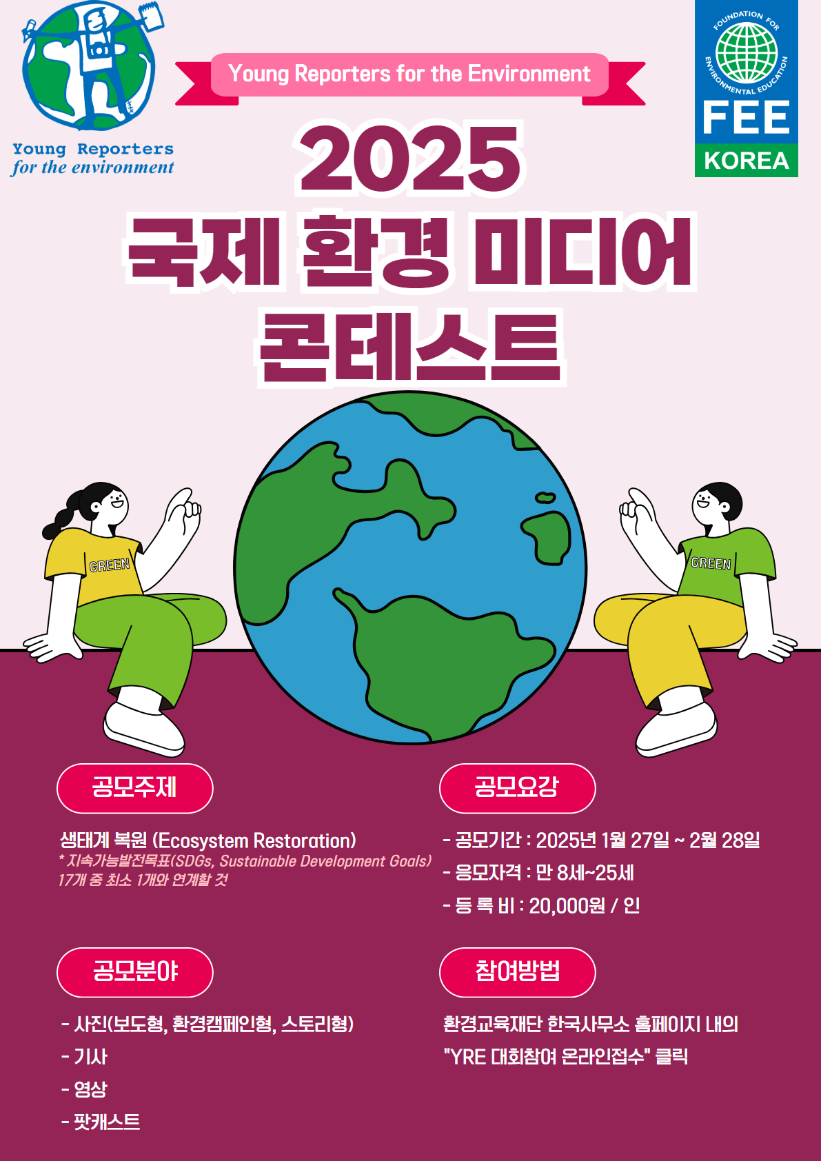 2025 국제청소년 환경미디어 콘테스트 공모분야 문학/시나리오, 사진/영상, 기타분야 접수기간2025.01.27 ~ 2025.02.28 D+341 종료 참가자격 청소년 주최재단법인환경교육재단한국사무소 1등상금(상품)기타 홈페이지 바로가기 첨부파일 다운로드 유의사항 ※본 내용은 참고 자료로 내용의 오류와 변동에 대해 책임지지 않습니다. (오류 및 변동 신고는 상단의 '제안/오류' 신고를 통해 해주십시오.) ※주최사 사정에 따라 일정 및 내용이 변경될 수 있으니 주최사 홈페이지 등을 통해 관련 안내를 수시로 확인하시기 바랍니다. 상세내용 ■ 제목2025 국제청소년 환경미디어 콘테스트 ■ 기간2025년 01월 27일 ~ 2025년 02월 28일 23:59까지 ■ 참가자격그룹C(Challenge): 만 8세~10세의 청소년그룹 N (Novice) : 만 11~14세의 청소년그룹 J (Junior) : 만 15~18세의 청소년그룹 S (Senior) : 만 19~25세의 청소년*작품 제출일 기준 만 나이이며, 팀의 경우 팀내 최연장자 나이 기준*그룹 C의 경우 사진분야만 접수가능*사진의 경우 그룹N, J, S 구분 없이 만 11~25세 단일그룹으로 분야별 참여 ■ 참여방법 / 접수방법<공모주제>생태계 복원(Ecosystem Restoration)*지속가능발전목표(SDGs, Sustainable Development Goals) 17개 중 최소 1개와 연계할 것 <공모분야>보도형 사진 / 환경캠페인형 사진 / 스토리형 사진(3-5장) / 기사(보고서, 에세이, 수필, 논문 등 형식 무관) / 영상 / 팟캐스트 <등록비 : 20,000원/인> <작품접수> www.fee-koera.org 내의 “YRE 대회참여” 온라인접수 ■ 시상내용 / 혜택시상은 각그룹별 (C, N, J, S), 개인/팀별, 분야(사진, 기사, 영상)별 별도시상 최우수상 : 그룹, 개인/팀, 분야별 각1작품우수상 : 그룹, 개인/팀, 분야별 각2작품장려상 : 그룹, 개인/팀, 분야별 각3작품* 모든 입상자에게 상장 및 부상 수여 ■ 기타사항등록자 전원에게 기념품 및 참가증 부여* 환경교육재단 본부에서 발급하는 영문 참가증* 국제 청소년 환경 미디어 콘테스트 기념 티셔츠제출 작품의 형식, 규격 등에 대한 내용은 핸드북 참고(작품의 형식 및 규격이 부적합할 경우 실격처리)* 금번 대회는 한글, 영어 중 택일하여 제출할 수 있습니다. 단, 한글로 제출된 작품이 국제대회 출품작으로 선정될 경우, 출품자는 번역 혹은 자막을 제작하여 제출하여야 합니다.* 한글, 영문 작품 동일한 기준으로 평가되며, 사용언어는 평가에 영향을 주지 않습니다.* 제출된 작품에 대한 저작권 및 소유권은 환경교육재단 한국사무소로 양도됩니다.* 전화문의는 평일 9~18시 사이에 가능합니다. 이외 시간에는 메일로 문의 주시기 바랍니다. 070-4047-5303 / info@fee-korea.org 목록