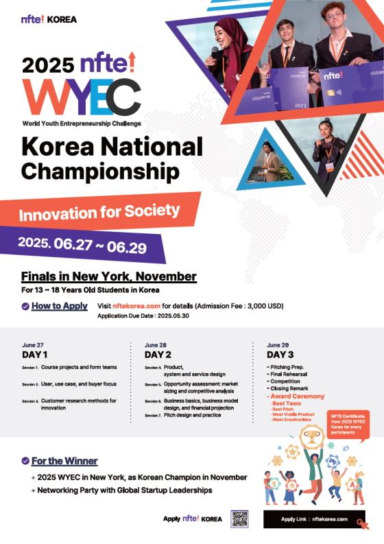 2025 WYEC - Korea National Championship 공모분야 기타분야 접수기간2024.11.01 ~ 2025.05.30 D+203 종료 참가자격 청소년 주최NFTE Korea 주관(주)유어라운드 1등상금(상품)기타 홈페이지 바로가기 첨부파일 다운로드 유의사항 ※본 내용은 참고 자료로 내용의 오류와 변동에 대해 책임지지 않습니다. (오류 및 변동 신고는 상단의 '제안/오류' 신고를 통해 해주십시오.) ※주최사 사정에 따라 일정 및 내용이 변경될 수 있으니 주최사 홈페이지 등을 통해 관련 안내를 수시로 확인하시기 바랍니다. 상세내용 ■ 제목2025 WYEC - Korea National Championship ■ 공모 목적 - 세계적으로 검증된 청소년 글로벌 프로그램인 NFTE 한국 도입 ※ NFTE는 1987년 뉴욕에서 시작된 사회적 가치 실현을 위한 교육을 목적으로 하는 비영리 단체로, 28개국을 대상으로 130만 명 가량의 교육생을 배출 ※ NFTE Korea는 주식회사 유어라운드가 NFTE로부터 한국 지부에 대한 정식 라이센스를 부여받아 운영 중 - NFTE에서 개최하는 세계 대회, 2025 WYEC에 출전할 대한민국 국가대표팀을 선발하기 위한 교육과 대회를 진행 ※ WYEC(World Youth Entrepreneurship Challenge)의 전신인 NYEC(National Youth Entrepreneurship Challenge)는 2006년부터 시작하여, 각 국가를 대표하는 팀들이 모여 사회 문제 해결을 위한 아이디어를 발표함 - 글로벌 트렌드에 맞는 역량(리더십, 영어토론능력, 문제해결능력)을 함양하여, 청소년들이 글로벌 리더로써 성장할 수 있는 기틀 마련 * 자세한 내용은 공식 홈페이지(www.nftekorea.com) 참고 ■ 기간 - 전체 모집 기간: 2024. 11. 01(금) ~ 2025. 05. 30(금) - 행사 일정 : 2025. 6. 27.(금) ~ 6. 29.(일) 2박 3일 - 장소 : 서울올림픽파크텔 ■ 참가자격만 13세 ~ 18세의 청소년 ■ 참여방법 / 접수방법<공모 주제> Innovation for Society <지원 방법> 공식 홈페이지(www.nftekorea.com)를 통해 참가 서류를 다운로드 받은 후 내용을 작성하여 제출 <활동 내용> 총 2박 3일의 기간 동안 참가 학생들은 해외 유수 대학 교수와 KAIST 교육 조교의 멘토링을 통하여, 2025 WYEC Korea를 준비함 * 자세한 내용은 공식 홈페이지(www.nftekorea.com) 참고 <참가비>3,000USD ■ 참가 혜택- 참가자 전원 대회 전 온라인 컨퍼런스 진행- 참가자 전원 2025 WYEC Korea 수료증 발급- Most Creative, Best Pitching 등 각 부문별 우수 팀에게 Award 시상* 일부 우수 학생들에 한하여 대학 교수의 추천서가 제공될 수 있음- 1등 팀에 한하여 대한민국 국가대표팀 자격으로 2025 WYEC 출전 권한 제공* WYEC 출전을 위한 멘토링 교육이 제공되며, 해당 교육 참여는 필수* 위 멘토링 교육에 참여하지 않을 경우, 팀 전원이 낙오* 위와 같은 경우, 후순위 팀에게 출전 권한 제공 예정 ■ 문의 - 이메일 : nftekorea@urround.com - 카카오톡 : NFTE Korea 채널 목록