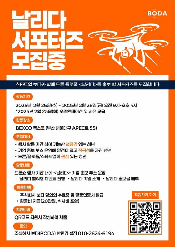 날리다 서포터즈 모집 (활동비 20만원 지급) 공모분야 기타분야 접수기간2025.01.29 ~ 2025.02.23 D+355 종료 참가자격 대학(원)생/청년 주최(주) 보다 1등상금(상품)기타 홈페이지 바로가기 첨부파일 다운로드 유의사항 ※본 내용은 참고 자료로 내용의 오류와 변동에 대해 책임지지 않습니다. (오류 및 변동 신고는 상단의 '제안/오류' 신고를 통해 해주십시오.) ※주최사 사정에 따라 일정 및 내용이 변경될 수 있으니 주최사 홈페이지 등을 통해 관련 안내를 수시로 확인하시기 바랍니다. 상세내용 ■ 제목날리다 서포터즈 모집 (활동비 20만원 지급) ■ 개요스타트업 보다(BODA)와 함께 <드론 플랫폼 '날리다'>를 홍보 할 서포터즈를 모집합니다. ■ 기간 - 모집 기간 2025년 1월 29일(수)~2025년 2월 23일(일) - 활동 기간 : 2025년 2월 26일(수)~2025년 2월 28일(금) 오전 9시~오후 4시 - 2025년 2월 25일(화) 오리엔테이션 및 사전교육 ※ 진행 장소 : BEXCO 벡스코(부산 해운대구 APEC로 55) ■ 참가자격 - 행사 활동 기간에 참여 가능한 책임감 있는 청년 - 기업 홍보 부스 운영에 열정이 있고 적극성을 가진 청년 - 드론/플랫폼/스타트업에 관심있는 청년 ■ 활동내용 - 드론쇼 행사 기간 내에 <드론 플랫폼 '날리다'> 기업 홍보 부스 운영 - 날리다 참여형 이벤트 진행 - 날리다 기업 소개 - 날리다 홍보물 배부 ■ 접수방법 - QR코드 지원서 작성하여 제출 - 지원하러가기: https://forms.gle/YpR2DTeDeA8oCkUX6 ■ 참여 혜택 - 주식회사 보다(BODA) 명의의 수료증 - 주식회사 보다(BODA) 명의의 활동인증서 발급 - 활동비 지급(20만원, 식사비 포함) ■ 유의사항서포터즈 활동일 모두 참여 가능해야 합니다. - 2025년 2월 26일(수)~2025년 2월 28일(금) 오전 9시~오후 4시 ■ 문의 주식회사 보다(BODA) 한민경 실장 - 전화 : 010-2624-6194 - 이메일 : droneboda@naver.com 목록