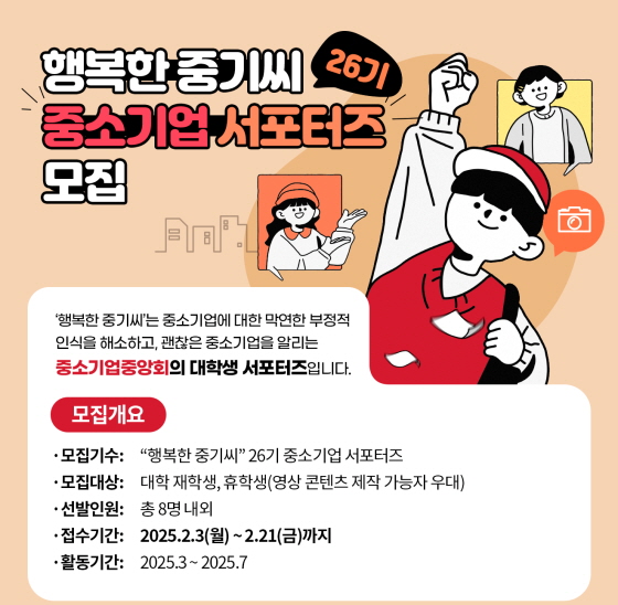 「행복한 중기씨」 26기 중소기업 서포터즈 모집 접수기간2025.02.03 ~ 2025.02.21 D+357 종료 참가자격 대학(원)생/청년 주최중소기업중앙회 1등상금(상품)기타 홈페이지 바로가기 첨부파일 다운로드 유의사항 ※본 내용은 참고 자료로 내용의 오류와 변동에 대해 책임지지 않습니다. (오류 및 변동 신고는 상단의 '제안/오류' 신고를 통해 해주십시오.) ※주최사 사정에 따라 일정 및 내용이 변경될 수 있으니 주최사 홈페이지 등을 통해 관련 안내를 수시로 확인하시기 바랍니다. 상세내용 ■ 제목「행복한 중기씨」 26기 중소기업 서포터즈 모집 ■ 기간 - 접수기간 : 2025. 2. 3.(월) ~ 2. 21.(금)까지 - 활동기간 : 2025. 3월 ~ 2025. 7월 ※ 진행장소 : 중소기업중앙회 여의도 본회 및 중소기업DMC타워(상암동) - 서류심사 결과 발표 : 2. 25. (개별 문자 및 이메일 안내) - 면접심사 : 2. 28. - 합격자 발표 : 3. 4. (블로그 공지) - 발대식 : 3. 12. ■ 참가자격대학 재학생, 휴학생(영상 콘텐츠 제작 가능자 우대) - 선발인원 : 총 8명 내외 ■ 활동내용① 월별 1회(팀별/개인별) 중소기업 인식개선 관련 콘텐츠 제작(영상, 카드뉴스, 포스팅 등)*팀 구성은 서포터즈 합격자를 대상으로 발대식 당일 구성②월별 정기 기획 회의 참여 필수*기획회의는 매월 첫 번째 금요일 오후 2시~6시(4시간) 진행되며, 중소기업중앙회 여의도 본회 및 중소기업DMC타워(상암동)에서 개최 예정③총 1회 이상 중소기업 일자리 관련 행사 필수 참여예) 정부부처 간담회 및 토론회, 취업박람회 등④팀별 우수 중소기업 현장탐방 영상 제작 1건 필수 ■ 접수방법 ① 중소기업중앙회 홈페이지 상단 [행사/이벤트] - [행사신청접수]에서 ‘행복한 중기씨 26기 모집’공고 내 ‘참여하기’ 버튼 클릭 ② 지원서 및 개인 포트폴리오 양식을 다운로드 받은 후 내용 작성하여 첨부 제출 필수 - 지원서 파일명 : 지원서_홍길동.pdf - 포트폴리오 파일명 : 포트폴리오_홍길동.pdf ※ 그 외 본인의 제작물 등 자유롭게 첨부 가능(선택) ■ 참여 혜택① 매월 활동비 지급 ② 수료증 수여 ③ 우수활동자(개인)/우수콘텐츠(팀) 상장 및 시상금 제공 *수료식 시 시상 ④ 중소기업 현장 탐방 기회 ⑤ 서포터즈 역량 강화교육 수강 ■ 유의사항 - 제출 기한과 양식을 지켜주세요. - 지원서 및 포트폴리오 내용이 표절로 밝혀질 경우 선발이 취소됩니다. - 합격 시 발대식(3월 12일 예정)은 필수 참석해야 하며, 참석 불가 시 합격이 취소될 수 있습니다. - 활동비 등 자세한 활동 혜택은 발대식 당일 안내합니다. - 지원서 내 사진 미첨부 시 불합격 처리 됩니다. ■ 문의중소기업중앙회 인력정책실 02-2124-3275 목록