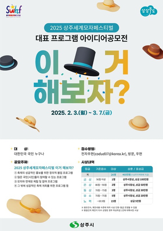 2025 상주세계모자페스티벌 대표 프로그램 아이디어 공모전 공모분야 기획/아이디어/마케팅, 정책 제안 접수기간2025.02.03 ~ 2025.03.07 D+343 종료 참가자격 제한없음 주최상주시청 1등상금(상품)기타 홈페이지 바로가기 첨부파일 다운로드 유의사항 ※본 내용은 참고 자료로 내용의 오류와 변동에 대해 책임지지 않습니다. (오류 및 변동 신고는 상단의 '제안/오류' 신고를 통해 해주십시오.) ※주최사 사정에 따라 일정 및 내용이 변경될 수 있으니 주최사 홈페이지 등을 통해 관련 안내를 수시로 확인하시기 바랍니다. 상세내용 ■ 제목2025 상주세계모자페스티벌 대표 프로그램 아이디어 공모전 ■ 기간접수기간 : 2025. 2. 3.(월) ~ 3. 7.(금) 18:00 접수분까지 유효 ■ 참가자격대한민국 국민 누구나 ■ 참여방법 / 접수방법<공모주제> 2025 상주세계모자페스티벌 이거 해보자? - 축제의 성공적인 홍보를 위한 창의적 붐업(Boom-Up) 프로그램 - 많은 국민(시민)들이 참여할 수 있는 프로그램 - 모자와 연계된 체험 및 참여 프로그램 - 그 밖에 성공적인 축제 개최를 위한 프로그램 등 <접수방법> 전자우편(codud07@korea.kr) 방문, 우편(상주시 상산로 223, 관광진흥과) <제출서류> [붙임1] 신청서(제안서), [붙임2] 개인정보 수집·이용 동의 ■ 시상내용 / 혜택 - 금상(1명, 상금 100만원 및 시장상) - 은상(2명, 상금 50만원 및 시장상) - 동상(3명, 상금 30만원 및 시장상) - 우수(5명, 상금 20만원 및 시장상) - 노력상(15명, 상금 5만원) ■ 유의사항1. 동일 또는 유사한 제안이 제출된 경우, 먼저 접수한 제안을 우선함2. 동일인의 제안이 다수 선정된 경우, 최상위 1건에 대해서만 선정3. 개인정보 허위 작성 시 심사에 제외될 수 있으며, 향후 공모전 참여 제한 등 불이익이 있을 수 있음4. 제출서류는 반드시 접수기간 내에 접수되어야 유효하며, 접수된 서류 등은 일체 반환하지 않음5. 선정된 제안서의 일체의 권리는 상주시에 귀속되며, 향후 홍보자료 등으로 활용될 수 있음(필요에 따라 수정 또는 변형하여 사용)6. 채택된 제안이 내부사정 등으로 정책에 반영되지 않을 수 있음7. 위에 언급되지 않은 내용 등에 대해서는 상주시의 결정에 따르며, 심사 결과에 대하여 이의를 제기하지 않음 ■ 문의상주시청 관광진흥과(054-537-7108) 목록