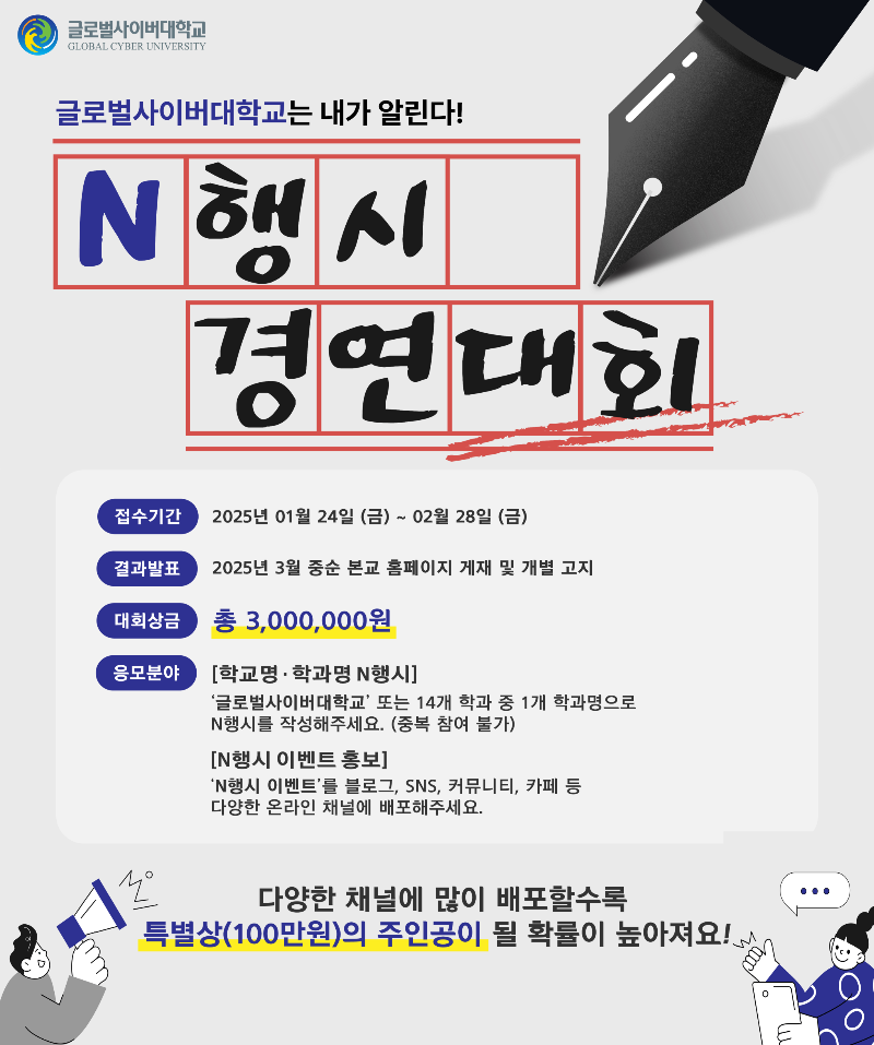 [글로벌사이버대학교] N행시 경연대회 공모분야 기획/아이디어/마케팅, 네이밍/슬로건, 문학/시나리오 접수기간2025.01.24 ~ 2025.02.28 D+350 종료 참가자격 제한없음 주최글로벌사이버대학교 1등상금(상품)100만원 이하 홈페이지 바로가기 첨부파일 다운로드 유의사항 ※본 내용은 참고 자료로 내용의 오류와 변동에 대해 책임지지 않습니다. (오류 및 변동 신고는 상단의 '제안/오류' 신고를 통해 해주십시오.) ※주최사 사정에 따라 일정 및 내용이 변경될 수 있으니 주최사 홈페이지 등을 통해 관련 안내를 수시로 확인하시기 바랍니다. 상세내용 ■ 제목[글로벌사이버대학교] N행시 경연대회 ■ 기간 - 참여기간 : 2025.1.24.(금)~2.28.(금) 당선작 발표 : 2025년 3월 중순 본교 홈페이지 게재 및 개별 고지 ■ 참가자격 글로벌사이버대학교에 관심 있는 모든 분 ■ 참여방법 / 접수방법<응모분야>- 학교명•학과명 N행시 ‘글로벌사이버대학교’ 또는 14개 학과명 중 한 개를선택하여 N행시 작성(★1인당 1회 참여 가능)- N행시 이벤트 홍보 ‘N행시 이벤트’를 블로그, SNS, 커뮤니티, 카페 등다양한 온라인 채널에 대량 배포 <참여방법> 네이버 폼으로 ‘N행시 작성’ 및 ‘N행시 이벤트 배포 링크’ 제출https://form.naver.com/response/nnFEbtUx8pyg9AEy2Vwhsg ■ 시상내용 / 혜택* 학교명•학과명 N행시 부문 [학교명] 대상 30만원(1명)/ 우수상 20만원(1명) / 장려상 10만원(1명) [학과명] 각 14개 학과별로 1인 선정(1인당 10만원)* N행시 이벤트 홍보 부문(특별상) : 100만원 ■ 유의사항- 표절 및 중복 응모시 자동 제외- 당선작 및 해당 콘텐츠에 대한 저작권은 대학 측과 공유- 개인정보 수집 및 이용에 대한 동의 필수 ■ 문의[문의] 글로벌사이버대학교 입학홍보팀 02-2160-1129 목록