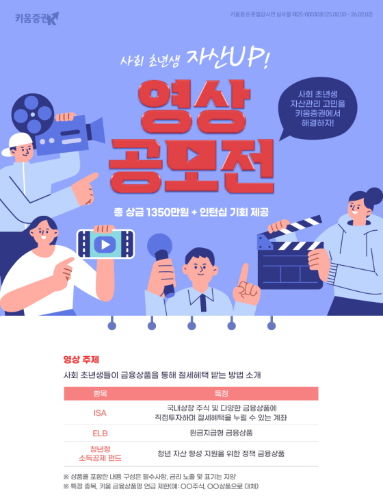 [키움증권]사회 초년생 자산UP! 영상 공모전 공모분야 사진/영상 접수기간2025.02.03 ~ 2025.03.31 D+320 종료 참가자격 제한없음 주최키움증권 1등상금(상품)500만원~1천만원 홈페이지 바로가기 첨부파일 다운로드 유의사항 ※본 내용은 참고 자료로 내용의 오류와 변동에 대해 책임지지 않습니다. (오류 및 변동 신고는 상단의 '제안/오류' 신고를 통해 해주십시오.) ※주최사 사정에 따라 일정 및 내용이 변경될 수 있으니 주최사 홈페이지 등을 통해 관련 안내를 수시로 확인하시기 바랍니다. 상세내용 ■ 제목[키움증권]사회 초년생 자산UP! 영상 공모전 ■ 기간 - 접수 기간 : 25.02.03 ~ 25.03.31 - 결과발표 : 접수 마감후 1개월 이내 (개별 통지 및 키움증권 웹사이트 공지) ■ 참가자격 - 대한민국 국민 누구나 참여 가능 ,개인 및 팀(최대 4인 참여 가능 ※ 중복 참여 가능하나 중복 수상 제한 ■ 참여방법 / 접수방법<공모 주제> - 사회 초년생들이 금융상품을 통해 절세혜택 받는 방법 소개 <제출 형식> - 서류제출 - 유튜브 일부공개 영상링크 첨부 - 영상제목 - 자유지정 - 제출방법 - 동영상을 유튜브에 업로드하고 URL을 복사하여 지원서 '영상 URL'란에 기입 <접수 방법> - 공모전 시행 홈페이지 방문 후 네이버 폼 접수 ■ 시상내용 / 혜택 - 대상 (1명) : 500만 원 (인턴십 기회 제공) - 최우수상 (1명) : 300만 원 - 우수상 (3명) : 100만 원 - 장려상 (5명) : 50만 원 ■ 유의사항유의사항 및 자세한 내용은 홈페이지 공고 참조 ■ 문의 - 키움증권 고객자산전략팀 담당자 이메일 : khan@kiwoom.co.kr - 키움증권 고객상담 센터 전화 : 1544-9100 목록