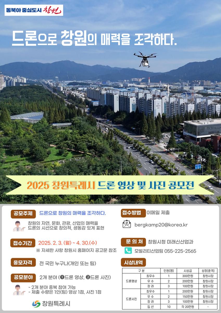 2025 창원특례시 드론 영상 및 사진 공모전 공모분야 사진/영상 접수기간2025.02.03 ~ 2025.04.30 D+290 종료 참가자격 제한없음 주최창원시 1등상금(상품)200만원~499만원 홈페이지 바로가기 첨부파일 다운로드 유의사항 ※본 내용은 참고 자료로 내용의 오류와 변동에 대해 책임지지 않습니다. (오류 및 변동 신고는 상단의 '제안/오류' 신고를 통해 해주십시오.) ※주최사 사정에 따라 일정 및 내용이 변경될 수 있으니 주최사 홈페이지 등을 통해 관련 안내를 수시로 확인하시기 바랍니다. 상세내용 ■ 제목2025 창원특례시 드론 영상 및 사진 공모전 ■ 개요 드론 영상 및 사진 공모전 개최로 드론의 일상화를 유도하고 우리 시의 우수한 자연, 문화, 관광 명소를 홍보하여 지역브랜드 가치를 높이고자 「2025 창원특례시 드론 영상 및 사진 공모전」을 아래와 같이 개최하오니 관심있는 분들의 많은 참여 바랍니다. ■ 기간공모(접수)기간: 2025. 2. 3.(월) ~ 4. 30.(수) 18:00까지수상작 발표: 2025. 6월 중 ■ 참가자격일반국민 누구나(개인 또는 팀 단위 참여) ■ 참여방법 / 접수방법<공모주제> 드론으로 창원의 매력을 조각하다. - 창원시의 자연, 문화, 관광, 산업의 매력을 드론의 시선으로 창의적, 생동감 있게 표현 <공모분야> 2개 분야 (❶ 드론 영상 ❷ 드론 사진)1) 드론 영상 : 1인(팀) 1점◦ 3분 이내의 mp4영상, 1920*1080 해상도(시나리오 포함)◦ 드론으로 직접 촬영한 영상이 전체 분량의 70%이상 2) 드론 사진 : 1인(팀) 1점◦ 긴쪽의 사이즈가 3,000픽셀 이상의 JPG형식◦ EXIF에서 촬영지 위도, 경도, 고도, 시간 등의 정보 확인 가능 <접수(제출) 방법> - 드론 영상 · 사진 : 담당자 이메일 제출 : bergkamp20@korea.kr - 제출파일명 : “2025 창원특례시 드론 영상 및 사진 공모전(접수자 또는 팀 대표자 성함)” - 제출 서류 및 양식 : 공고문 참조 ■ 시상내용 / 혜택시상 내역 : 총상금 2천만 원 구 분인원(명)시상금상장(훈격)드론영상(6)(총 1천만 원)최 우 수1300만원창원시장우 수2200만원창원시장장 려3100만원창원시장드론사진(16)(총 1천만 원)최 우 수1200만원창원시장우 수2150만원창원시장장 려3100만원창원시장입 선10 각 20만원- ※ 심사결과 적합한 작품이 없을 경우, 시상 인원·시상금이 조정 및 미선정될 수 있음 ■ 유의사항 - 영상과 사진은 공모기간(2025.2.3. ~ 4.30.) 내 촬영된 영상물(결과물)이어야 함 - 자세한 유의사항은 홈페이지 공고문 참조 ■ 문의 창원시 미래신산업과 모빌리티산업팀 ( 055-225-2565 ) 목록