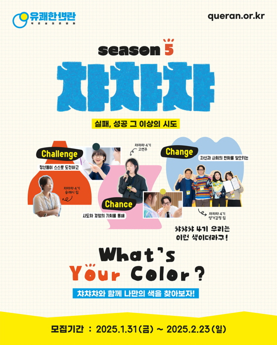 2025 챠챠챠 5기 모집 접수기간2025.01.31 ~ 2025.02.23 D+356 종료 참가자격 기타 제한 주최사단법인 유쾌한반란 1등상금(상품)기타 홈페이지 바로가기 첨부파일 다운로드 유의사항 ※본 내용은 참고 자료로 내용의 오류와 변동에 대해 책임지지 않습니다. (오류 및 변동 신고는 상단의 '제안/오류' 신고를 통해 해주십시오.) ※주최사 사정에 따라 일정 및 내용이 변경될 수 있으니 주최사 홈페이지 등을 통해 관련 안내를 수시로 확인하시기 바랍니다. 상세내용 ■ 제목2025 챠챠챠 5기 모집 ■ 개요유쾌한 반란은 청년의 ‘하고 싶은 일을 찾는 시도’를 응원합니다.최종 선발된 팀은 유쾌한반란의 전방위적 지원하에 프로젝트를 실행하게 됩니다. ※ 최대 1,000만원의 활동지원금, 교육, 멘토링, 컨설팅 등 ■ 기간 - 접수기간 : 25년 1월 31일(금) ~ 25년 2월 23일(일) - Part1 합격자 발표 : 3월 27일(목) - 활동기간 : 4월~12월 ■ 참가자격 - ‘하고 싶은 일’에 대한 고민의 시간을 갖고 싶은 청춘 누구나 - 실패에 대한 두려움을 깨고 싶은 청춘 누구나 - 지원 가능 연령 : 19세 ~ 34세(92년 01월 ~ 07년 12월생) ※ 팀 구성 : 개인 또는 4인 이하 ※ 직장인, 사업자, 재학생도 지원 가능하나, 챠챠챠 프로젝트에 집중해 참가할 수 있는 충분한 시간을 스스로 확보해야 함 ■ 활동내용 1) ‘하고 싶은 일’을 함께 고민하는 Part1 - 서류평가를 통과한 30팀 이내 - 기간 : 2개월 (4.5~5.24) - 최대 160만원 지원 2) ‘하고 싶은 일’을 시도하는 Part2 - Part1에서 최종 선발된 10팀 이내 - 기간 : 4개월 (6.1~9.30) - 최대 1,000만원 지원 ■ 지원 방법 - 유쾌한반란 홈페이지(www.queran.or.kr) → 챠챠챠 → 모집공고 → URL클릭 → 구글 로그인 → 구글 폼을 통한 지원서 제출 ■ 참여 혜택 - 최대 1,000만원의 활동 지원금 - 교육, 멘토링, 컨설팅 등 ■ 유의사항 기타 상세한 내용과 유의사항은 홈페이지 공고문 참조 ■ 문의 chachacha@queran.or.kr 메일 문의 또는 홈페이지 모집공고 하단 ‘질문하기’ 이용 목록