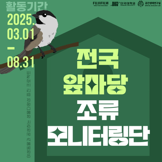 후지필름 코리아와 함께하는 2025 전국 앞마당 조류 모니터링단 접수기간2025.02.03 ~ 2025.02.17 D+362 종료 참가자격 제한없음 주최단국대학교 후원/협찬후지필름 코리아 1등상금(상품)기타 홈페이지 바로가기 첨부파일 다운로드 유의사항 ※본 내용은 참고 자료로 내용의 오류와 변동에 대해 책임지지 않습니다. (오류 및 변동 신고는 상단의 '제안/오류' 신고를 통해 해주십시오.) ※주최사 사정에 따라 일정 및 내용이 변경될 수 있으니 주최사 홈페이지 등을 통해 관련 안내를 수시로 확인하시기 바랍니다. 상세내용 ■ 제목후지필름 코리아와 함께하는 2025 전국 앞마당 조류 모니터링단 ■ 개요단국대학교 공간생태연구실에서 운영하는 「전국 앞마당 조류 모니터링단」은 2021년부터 도심 내 번식지가 부족한 박새, 곤줄박이 등 소형 조류를 위해 인공새집을 제공하고, 이를 장기적으로 관찰하며 연구하는 생물다양성 증진 프로젝트입니다. ■ 기간 - 접수기간 : 2월 3일 ~ 2월 17일 - 활동기간 : 3월 1일 ~ 8월 31일 ■ 참가자격누구나 참여 가능 ■ 활동내용1. 제공받은 인공새집을 설치하고 직접 조류를 관찰하며 도시 생태계 보호에 동참하세요! 2. 전문적인 지식이 없어도 누구나 참여할 수 있는 시민과학 프로젝트입니다.인공새집 모니터링을 통해 도심 속 생물다양성을 연구하고 보전하는 데 기여해 보세요! 국내 최대 규모의 인공새집 관찰 커뮤니티 - 전문 조사자 및 시민 과학자들과 소통하며, 관찰 데이터를 공유하고 피드백을 받을 수 있습니다. - 시민 과학자들을 위한 온라인 커뮤니티가 조성되어 있어 자유롭게 의견을 나눌 수 있습니다. ■ 접수방법홈페이지 공지글을 통해 접수 ■ 참여 혜택참가자 전원에게 전문가용 인공새집 무상 제공 & 활동 수료증 발급!쉽고 빠른 인공새집 관찰 플랫폼 제공 목록