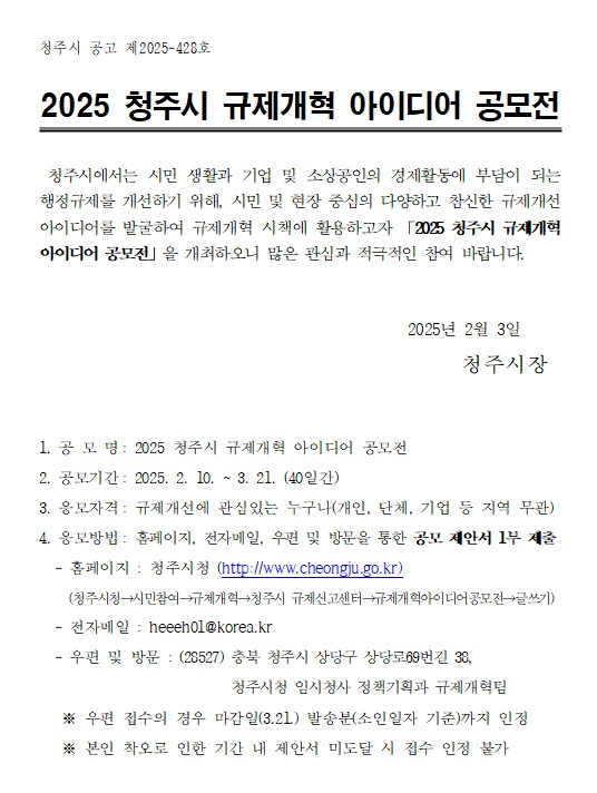 2025 청주시 규제개혁 아이디어 공모전 공모분야 기획/아이디어/마케팅, 정책 제안 접수기간2025.02.10 ~ 2025.03.21 D+331 종료 참가자격 제한없음 주최청주시 1등상금(상품)100만원 이하 홈페이지 바로가기 첨부파일 다운로드 유의사항 ※본 내용은 참고 자료로 내용의 오류와 변동에 대해 책임지지 않습니다. (오류 및 변동 신고는 상단의 '제안/오류' 신고를 통해 해주십시오.) ※주최사 사정에 따라 일정 및 내용이 변경될 수 있으니 주최사 홈페이지 등을 통해 관련 안내를 수시로 확인하시기 바랍니다. 상세내용 ■ 제목2025 청주시 규제개혁 아이디어 공모전 ■ 기간 - 공모기간: 2025. 2. 10. ~ 3. 21. (40일간) - 결과발표 : 2025. 6월 예정 ※ 수상자 개별통지 ※ 심사일정에 따라 발표 일정 변동 가능 ■ 참가자격규제개선에 관심있는 누구나(개인, 단체, 기업 등 지역 무관) ■ 참여방법 / 접수방법<공모분야> 불합리한 규제의 내용 및 개선방안(법령, 제도, 규정 등) 분 야세 부 내 용생활 불편부담 개선▶ 인·허가, 면허, 증명 신청 시 갖춰야 하는 요건과 기준▶ 신고, 보고, 인증 등 의무 부과 사항▶ 신청서 외 각종 증명서 등의 과도한 제출▶ 수수료, 부담금 등의 지나친 납부형태, 방법, 기간지역경제활성화▶ 중소기업 입지, 고용, 생산 등 기업경영 애로 규제▶ 자영업자·소상공인 신고·허가, 생산, 유통, 판매 등 영업활동 애로▶ 농촌 활성화, 관광산업 활성화, 전통시장 활성화 등 저해 규제▶ 청년, 취업, 경력단절 등 창업 및 고용 관련미래산업▶ 첨단 의료, 바이오, 신기술, 신재생에너지 등 규제 애로기타▶ 기타 모든 분야 규제개선이 필요한 사항 ※ 분야별 세부내용과 관계없이 개선이 필요한 행정규제는 모두 해당 ※ 비규제(조세/과태료·과징금/보조금 등), 단순 진정, 민원 사항, 온라인 서비스 확대, 규제 강화내용 등은 제외 <응모방법> 홈페이지, 전자메일, 우편 및 방문을 통한 공모 제안서 1부 제출 - 홈페이지 : 청주시청 (http://www.cheongju.go.kr) (청주시청→시민참여→규제개혁→청주시 규제신고센터→규제개혁아이디어공모전→글쓰기) - 전자메일 : heeeh01@korea.kr - 우편 및 방문 : (28527) 충북 청주시 상당구 상당로69번길 38,청주시청 임시청사 정책기획과 규제개혁팀 ※ 우편 접수의 경우 마감일(3.21.) 발송분(소인일자 기준)까지 인정 ※ 본인 착오로 인한 기간 내 제안서 미도달 시 접수 인정 불가 ■ 시상내용 / 혜택 - 최우수 1명(50만 원), 우수 2명(각 30만 원), 장려 9명(각 10만 원) ※ 심사 결과에 따라 시상내용 조정 가능 ■ 유의사항 - 본인 제안이 아닐 경우(표절, 무단 도용 등)는 심사대상에서 제외 ※ 우수 제안 선정 이후라도 유의사항 위반이 확인될 경우, 수상취소 및 시상금 환수 - 본인 착오(우편 발송 주소, 전자메일 주소, 공모 기간 등)로 인한 기간 내 제안서 미도달 시 접수 불인정 - 동일한 내용의 제안이 접수될 경우 먼저 접수된 제안만 인정 - 타 기관 공모에서 기 선정된 아이디어의 경우 최종 시상 대상 제외 - 1인당 제출건수 제한은 없으며, 타 제안과 내용 중복 시 최초 제안만 인정 - 응모 제안 당선 건 제반 권리는 청주시에 귀속되며, 향후 활용 과정에서 주최 측에 의하여 제안내용이 보완‧수정될 수 있음 - 최적안이 없을 경우 제안의 전부 또는 일부를 선정하지 않을 수 있음 - 과제 응모 시 반드시 공모 제안서 서식에 따라 작성하여야 함 ■ 문의청주시 정책기획과 (043-201-1208) 목록