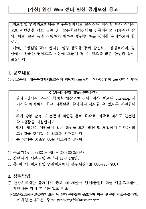 연강의료재단 병원형 WEE센터 명칭 공모 공모분야 네이밍/슬로건 접수기간2025.02.03 ~ 2025.02.28 D+353 종료 참가자격 기타 제한 주최연강의료재단 1등상금(상품)100만원 이하 홈페이지 바로가기 첨부파일 다운로드 유의사항 ※본 내용은 참고 자료로 내용의 오류와 변동에 대해 책임지지 않습니다. (오류 및 변동 신고는 상단의 '제안/오류' 신고를 통해 해주십시오.) ※주최사 사정에 따라 일정 및 내용이 변경될 수 있으니 주최사 홈페이지 등을 통해 관련 안내를 수시로 확인하시기 바랍니다. 상세내용 ■ 제목연강의료재단 병원형 WEE센터 명칭 공모 ■ 기간 - 공모기간 : 2025.02.03.(월) ~ 2025.02.28.(금) - 결과발표 : 25.03.14 (금) 개별 통지 예정 ■ 참가자격 제주도민 누구나 (1인 1제안) ■ 참여방법 / 접수방법<공모주제> 제주특별자치도교육청 병원형 wee 센터 ‘(가칭) 연강 wee 센터’ 명칭 <참여방법>○ 연강의료재단 홈페이지 공고 내 제안서 양식(붙임1, 2)을 다운로드받아, 제안내용 작성 후 이메일로 제출 ※ 2025.02.28.(금) 18:00까지 도착 된 전자 우편물만 유효하며, 방문 및 우편 제출은 불가함. - 이메일(전자우편) 주소: yeonkang7900@naver.com ■ 시상내용 / 혜택 등급인원상금 또는 부상비고최우수상1명50만 원심사 항목 및 기준에 따라 총 3편을 선정하여 시상우수상1명30만 원장려상1명10만 원참가상30명모바일 음료 쿠폰 각 1매전체 응모자 중 추첨하여 제공 ※ 공모 접수 및 심의 결과 심사 기준에 부합하지 않을 경우, 수상작이 없을 수도 있음※ 상금은 세금 공제후 지급 됩니다. ■ 유의사항○ 제안자의 성명(실명), 주소, 연락처, 응모 내용 등 기재 사항이 누락되지 않도록 하여야 함.○ 신청 서류는 붙임 서식에 의해 작성(1인 1건, 나열한 경우 또는 추가 제안한 경우 최초 1건만 제안으로 인정).○ 응모자는 제안서를 기한 내에 제출하여야 하며, 응모자 책임으로 제출되지 못한 경우 그 책임은 응모자에게 있음.○ 수상작에 대한 상표권(저작권)은 의료법인 연강의료재단에 귀속됨.○ 수상작으로 선정되더라도 심사위원회 논의 결과 연강 wee 센터 명칭으로 적용되지 않을 수 있으며, 활용 단계에서 내용 수정이 발생할 수 있음.○ 수상작이 없을 수도 있으며, 출품작의 명칭이 타인과 동일한 경우, 제출 시점을 기준으로 먼저 접수된 건이 우선함(동일 명칭이나 다른 의미는 다른 제안으로 인정).○ 제출된 응모작은 순수 창작된 것으로 일부가 표절되었거나, 기 발표 또는 타 공모전 수상작은 심사 대상에서 제외됨.○ 제출된 응모작의 저작권 분쟁에 따른 모든 문제는 응모자의 책임이며, 수상 이후라도 표절된 것으로 판명될 경우 수상을 취소하며 부상금 환수 조치(이로 인한 손해 발생 시 손해배상 할 수 있음).○ 제출된 응모작은 반환되지 않음. ■ 문의의료법인 연강의료재단 총무팀장 (064-726-7900) 목록