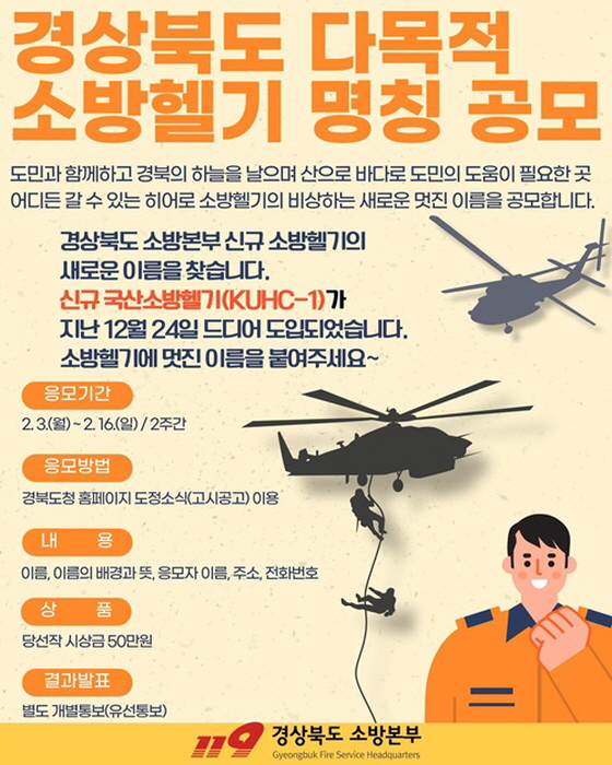 경상북도 다목적 소방헬기 명칭 공모 공모분야 네이밍/슬로건 접수기간2025.02.03 ~ 2025.02.16 D+365 종료 참가자격 기타 제한 주최경상북도 소방본부 1등상금(상품)100만원 이하 홈페이지 바로가기 첨부파일 다운로드 유의사항 ※본 내용은 참고 자료로 내용의 오류와 변동에 대해 책임지지 않습니다. (오류 및 변동 신고는 상단의 '제안/오류' 신고를 통해 해주십시오.) ※주최사 사정에 따라 일정 및 내용이 변경될 수 있으니 주최사 홈페이지 등을 통해 관련 안내를 수시로 확인하시기 바랍니다. 상세내용 ■ 제목경상북도 다목적 소방헬기 명칭 공모 ■ 기간 - 접수 : 2025. 2. 3.(월) ~ 2. 16.(일) (2주간) - 결과발표 : 2025. 3.12.(수) 수상자 개별통보 ■ 참가자격 경상북도 도민 (도청직원 포함) ■ 참여방법 / 접수방법<공모 주제>경상북도 소방본부의 위상을 나타낼 수 있는 소방헬기 명칭 공모 <제출 형식> - 공모 신청서 1부 (개인정보 수집·이용 동의서 포함) ※ 작성요건 : 5자 내외 명칭 (국문기준) ※ 제안 의미 포함 붙임 작성 서식에 맞춰 제출 <접수 방법> 이메일, 팩스, 우편 - 이메일 : mimosacake@korea.kr - 팩스 : 054-256-9121 - 우편 : (우 : 37527) 경북 포항시 북구 기계면 내단길86번길 19-59 ■ 시상내용 / 혜택 당선작 시상금 50만원 지급 ■ 유의사항 - 개인별 응모건수는 3건으로 제한하며, 중복 수상은 불가 - 제3자의 저작권, 초상권 등을 침해하는 작품은 불가하며 선정도 취소 - 명칭이 같은 경우 선 순위 접수자에 우선권 부여 - 당선 명칭의 저작권 등 일체의 권리는 경상북도에 귀속됨과 동시에 작품의 수정, 보완 등에 관한 일체의 권한은 경상북도 119특수대등단에 있음 - 당선 명칭 중 이미 공개 또는 발표되었거나 다른 명칭을 모방한 것으로 인정되는 작품은 입상 결정 후라도 취소할 수 있음 - 제안내용에 따라 해당 당선작이 없을 수도 있음 ■ 문의경북119특수대응단 119항공대 (054-880-6520) 목록