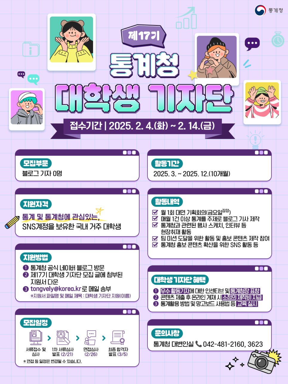 제17기 통계청 대학생 기자단 모집 접수기간2025.02.04 ~ 2025.02.14 D+367 종료 참가자격 대학(원)생/청년 주최통계청 1등상금(상품)기타 홈페이지 바로가기 첨부파일 다운로드 유의사항 ※본 내용은 참고 자료로 내용의 오류와 변동에 대해 책임지지 않습니다. (오류 및 변동 신고는 상단의 '제안/오류' 신고를 통해 해주십시오.) ※주최사 사정에 따라 일정 및 내용이 변경될 수 있으니 주최사 홈페이지 등을 통해 관련 안내를 수시로 확인하시기 바랍니다. 상세내용 ■ 제목제17기 통계청 대학생 기자단 모집 ■ 기간 - 모집 기간 : 2025. 2. 4.(화) ~ 2. 14.(금) - 활동 기간 : 2025. 3. ~ 12. (약 10개월) ■ 참가자격 통계 및 통계청에 관심 있는, SNS 계정을 보유한 국내 거주 대학생 누구나 ■ 활동내용 - 월 1회 대면 기획회의(금요일, 잠정) - 매월 1건 이상 통계를 주제로 블로그 기사 제작 - 통계청과 관련된 행사 스케치, 인터뷰 등 현장취재 활동 - 팀미션 도달을 위한 활동 및 홍보 콘텐츠 제작 참여 - 통계청 홍보 콘텐츠 확산을 위한 SNS 활동 등 ■ 지원방법 ① 통계청 공식 네이버 블로그 방문 (https://blog.naver.com/hi_nso/223747060372) ② 제17기 대학생 기자단 모집 글에 첨부된 지원서 다운 ③ tongvely@korea.kr로 메일 전송 ※ 지원서 파일명 및 메일 제목 : 대학생 기자단 지원(이름) ■ 참여 혜택 - 우수 활동기자에 대한 인센티브 지급 및 통계청장 표창 - 콘텐츠 제출 후 온라인 게재 시 소정의 제작비 지급 - 통계활용 방법 및 망고보드 사용법 교육 실시 ■ 문의 통계청 대변인실 : 042-481-2160, 3623 목록