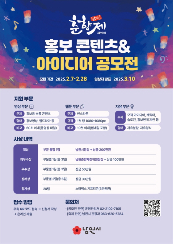 제95회 남원 춘향제 홍보 콘텐츠 & 아이디어 공모전 공모분야 기획/아이디어/마케팅, 정책 제안, 사진/영상, 웹툰/포스터/미술 접수기간2025.02.07 ~ 2025.02.28 D+354 종료 참가자격 제한없음 주최전라북도 남원시 주관포이시스 1등상금(상품)200만원~499만원 홈페이지 바로가기 첨부파일 다운로드 유의사항 ※본 내용은 참고 자료로 내용의 오류와 변동에 대해 책임지지 않습니다. (오류 및 변동 신고는 상단의 '제안/오류' 신고를 통해 해주십시오.) ※주최사 사정에 따라 일정 및 내용이 변경될 수 있으니 주최사 홈페이지 등을 통해 관련 안내를 수시로 확인하시기 바랍니다. 상세내용 ■ 제목제95회 남원 춘향제 홍보 콘텐츠 & 아이디어 공모전 ■ 기간 - 접수기간 : 2025년 2월 7일 (금) ~ 2025년 2월 28일 (금) 18시 - 결과발표 : 2025년 3월 10일 (월) (개별 통보) ■ 참가자격 춘향제에 관심 있는 국민 누구나 / 개인 또는 팀 참가(팀을 구성 시 3인 이하 구성) ■ 참여방법 / 접수방법<공모 주제> - 다양한 계층에 춘향제를 알리기 위한 홍보 콘텐츠 기획 제작 - 춘향제를 홍보할 수 있는 다양한 아이디어 - 춘향제와 K-컬쳐의 적절한 콜라보로 이루어진 모객 & 홍보제안 <지원부문>1. 영상 - 홍보용 숏폼 콘텐츠 - 웹드라마, 뮤직비디오, 애니메이션 등 춘향제 관련 홍보 콘텐츠 (완성된 콘텐츠 제출) - 60초 이내 동영상 파일 - 해상도 1920 x 1080px (FHD) 이상 / 용량 : 300mb 이하 - 동영상 파일 형식 : avi, mp4, mpv 2. 웹툰 - 인스타 스토리툰, 웹툰, 캐릭터, 홍보용 이미지 기획 등 (완성된 콘텐츠 제출) - 한 컷당 크기 1080 * 1080px 사이즈 - 10컷 이내(썸네일 포함) - 해상도 300dpi 이상 / 용량 - 20mb 이하 - JPEG, PNG,파일 Zip으로 변환 후 접수 ※ 망고보드 및 카드뉴스 제작 프로그램은 사용 불가 ※ 아이디어나 제안은 영상, 웹툰이 아닌 자유부문으로 응시 3. 자유부문 - 모객 아이디어, 캐릭터, 슬로건, 홍보연계 제안 등 홍보 콘텐츠 및 아이디어 - 자유분량, 자유형식 <접수방법> 포스터의 QR코드 접속 후 신청서 작성하여 온라인 제출 ■ 시상내용 / 혜택 - 대상 (통합 1팀) : 남원시장상 + 상금 200만원 - 최우수상 (부문별 1팀) : 남원춘향제전위원장상 + 상금 100만원 - 우수상 (부문별 1팀) : 상금 50만원 - 장려상 (부문별 2팀) : 상금 30만원 - 참가상 (20팀) : 스타벅스 기프티콘 3만원권 ■ 문의 - 공모전 문의 : 공모전 운영관리처 02-2102-7105 - 남원시 축제 문의 : 남원시 관광과 063-620-5784 ※ 문의 가능 요일 및 시간 : 월~금 09:30~17:30 / 공휴일, 점심시간(12:00~13:00) 제외 목록