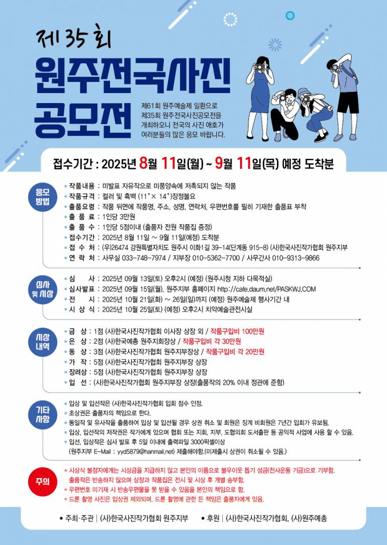 제35회 원주전국사진공모전 공모분야 사진/영상 접수기간2025.08.11 ~ 2025.09.11 D+159 종료 참가자격 제한없음 주최(사)한국사진작가협회 원주지부 후원/협찬(사) 한국사진작가협회, (사) 원주예총 1등상금(상품)100만원~199만원 홈페이지 바로가기 첨부파일 다운로드 유의사항 ※본 내용은 참고 자료로 내용의 오류와 변동에 대해 책임지지 않습니다. (오류 및 변동 신고는 상단의 '제안/오류' 신고를 통해 해주십시오.) ※주최사 사정에 따라 일정 및 내용이 변경될 수 있으니 주최사 홈페이지 등을 통해 관련 안내를 수시로 확인하시기 바랍니다. 상세내용 ■ 제목제35회 원주전국사진공모전 ■ 기간 - 접수 기간 : 2025년 8월 11일 ~ 9월 11일 (마감일까지 도착분) - 심사일시 : 2025년 9월 13일(토) 오후2시 (예정) / 장소 : 원주시청 지하 다목적실 - 결과발표 : 2025년 9월 15일(월) / 원주지부 홈피 http://cafe.daum.net/PASKWJ.COM - 개전 및 시상일시 : 2025년 10월 25일(토) (예정) 오후2시 / 장소 : 치악예술관전시실 - 전시기간 : 2025년 10월 21일~26일까지(예정) 원주예술제 행사기간 내 / 치악예술관전시실 ■ 참가자격 전국 사진애호가 및 사진동호회 ■ 참여방법 / 접수방법 - 작품내용 : 미발표 자유작으로 미풍양속에 저촉되지 않는 작품 - 작품규격 : 컬러 및 흑백 (11"X 14")장정불요 - 출품수 : 1인5점 - 출품료 : 1인 30,000원 - 접수처 : (우) 26474 강원도 원주시 이화1길39-14호(단계동 915-8) (사)한국사진작가협회 원주지부 - 출품요령 : 작품 뒷면에 작품명.주소.성명.연락처.우편번호를 필히 기재한 출품표 부착 ■ 시상내용 / 혜택 - 금 상: 1점 (사)한국사진작가협회 이사장 상장 외 작품구입비 1.000.000원 - 은 상: 2점 (사)한국예총 원주지회장상 작품구입비 각 300,000원 - 동 상: 3점 (사)한국사진작가협회 원주지부장상 작품구입비 각 200,000원 - 가 작: 5점 (사)한국사진작가협회 원주지부장 상장 - 장려상: 5점 (사)한국사진작가협회 원주지부장 상장 - 입 선: (사)한국사진작가협회 원주지부장 상장(출품작의 20% 이내 정관에 준함) ■ 유의사항 - 입상 및 입선작은 (사)한국사진작가협회 입회점수 인정 - 초상권은 출품자의 책임으로 한다. - 동일작 및 유사작을 출품하여 입상 및 입선될 경우 상권 취소 및 회원은 징계 비회원은 7년간 입회가 유보됨. - 입상,입선작의저작권은 작가에게 있으며 협회 또는지회, 지부,도협의회 도서출판 등 공익적 사업에 사용 할 수 있음. - 입선, 입상작은 심사 발표 후 5일 이내에 출력파일 3000픽셀이상 (원주지부 E-Mail : yyd5879@hanmail.net)제출해야함.(미제출시 상권이 취소될 수 있음.) ■ 문의 사무실 : 033-748-7974 지부장:010-5362-7700 사무간사:010-9313-9866 목록
