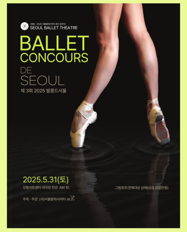 2025 발레 콩쿠르 드 서울 (Ballet concourse de seoul) 접수기간2025.02.03 ~ 2025.05.21 D+272 종료 참가자격 제한없음 주최(사)서울발레시어터 1등상금(상품)200만원~499만원 홈페이지 바로가기 첨부파일 다운로드 유의사항 ※본 내용은 참고 자료로 내용의 오류와 변동에 대해 책임지지 않습니다. (오류 및 변동 신고는 상단의 '제안/오류' 신고를 통해 해주십시오.) ※주최사 사정에 따라 일정 및 내용이 변경될 수 있으니 주최사 홈페이지 등을 통해 관련 안내를 수시로 확인하시기 바랍니다. 상세내용 ■ 제목2025 발레 콩쿠르 드 서울 (Ballet concourse de seoul) ■ 개요2023년에 시작한 발콩드서울은 다양한 국내 발레 인재들을 조기에 발굴하고전세계인이 보는 갈라 무대에 설 수 있는 기회를 제공합니다. ■ 기간 - 접수 기간 : 2025년 2월 3일(월) ~ 5월 21일(수) 16:00까지 - 경연 일시 : 2025. 5. 31(토) 강동아트센터 대극장 한강 ■ 참가자격 누구나 제한 없음 (유소년은 물론, 성인 전공 / 비전공자까지 폭넓게 참가 가능) ■ 참여방법 / 접수방법<경연분야> - 초등부 : 저학년 / 중학년 / 고학년 - 중등부 : 저학년 / 고학년 - 고등부 : 저학년 / 고학년 - 일반부 : 발레 전공자 / 비전공자 ※ 각 부문 개인 / 단체 지원 가능 <참가부문>- 클래식&창작 <참가비>- 개인 : 146,000원- 단체 : 190,000원 (3인 이상일 시 인당 2만원 추가) ※ 접수 수수료는 참가자가 부담하며, 접수 후 환불 불가 <접수방법> 이상댄스 온라인 접수로 참가 가능 - 참가자 성명으로 이상댄스 사이트 회원 가입 후 접수 - 접수 시 음원 mp3 업로드 필수, 당일 예비음원 지참 (USB) ■ 시상내용 / 혜택(1) 개인부문 - 그랑프리 : 상패 및 상금 200만원 - 대상 : 상장 및 메달 - 금상 / 은상 / 동상 : 상장 및 메달 - 장려상 : 상장 (2) 단체부문- 대상 : 상장 및 메달- 금상 / 은상 / 동상 : 상장 및 메달- 장려상 : 상장 ■ 유의사항자세한 내용은 홈페이지 공지를 참조 바랍니다. ■ 문의 - 발콩드서울 사무국 : 02-3442-2637 (오전 10시 ~ 오후 3시) - 이메일 : sbt1week@gmail.com ※ 운영시간 외에는 메일 문의 부탁드립니다. (성명, 연락처 기재) 목록