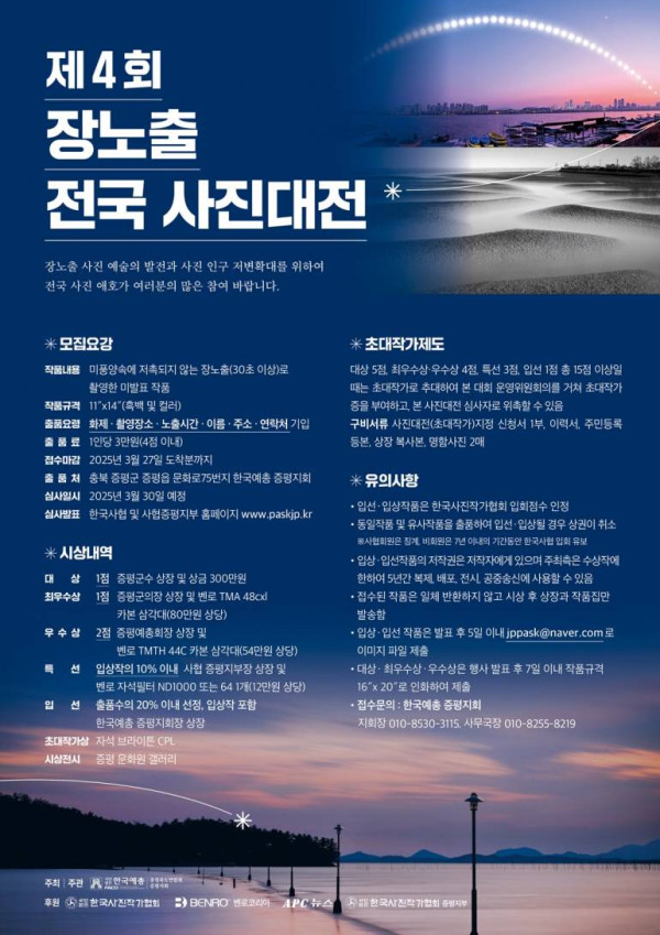제4회 장노출 전국사진 대전 공모분야 사진/영상 접수기간2025.01.27 ~ 2025.03.27 D+327 종료 참가자격 제한없음 주최한국예총 충청북도 연합회 증평지회 주관한국예총 충청북도 연합회 증평지회 후원/협찬한국사진작가협회, 벤로코리아, APC뉴스, 한국사진작가협회 증평지부 1등상금(상품)200만원~499만원 홈페이지 바로가기 첨부파일 다운로드 유의사항 ※본 내용은 참고 자료로 내용의 오류와 변동에 대해 책임지지 않습니다. (오류 및 변동 신고는 상단의 '제안/오류' 신고를 통해 해주십시오.) ※주최사 사정에 따라 일정 및 내용이 변경될 수 있으니 주최사 홈페이지 등을 통해 관련 안내를 수시로 확인하시기 바랍니다. 상세내용 ■ 제목제4회 장노출 전국사진 대전 ■ 기간 - 접수 기간 : ~ 2025년 3월 27일 우편 도착분까지 마감 ■ 참가자격제한없음 ■ 참여방법 / 접수방법 - 작품내용 : 미풍양속에 저촉되지 않은 장노출 30초이상 촬영한 미발표 작품 - 작품규격 : 11x14 - 출품수 : 4점이내 - 작품 접수처 : 충북 증평군 증평읍 문화로 75번지 한국예총 증평지회 - 출품료 : 30,000원 ■ 시상내용 / 혜택 - 대 상 : 1점 증평군수 상장 및 상금 300만원 - 최우수상 : 1점 증평군의장 상장 및 벤로TMA 48 cxl 카본 삼각대 - 우수상 : 2점 증평예총회장 상장 및 벤로TMTH 44c 카본 삼각대 - 특선 : 입선작의 10%이내 한국사협 증평지부장 상장 및 벤로 자석 ND1000 - 입선 : 출품수의 20%이내 한국예총 증평지회장 상장 ■ 유의사항 유의사항 및 상세 내용은 포스터, 홈페이지 공고 참조 ■ 문의 지회장 010-8530-3115 사무국장 010-8255-8219 목록