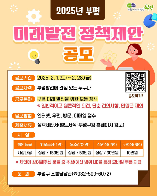 2025년 부평 미래발전 정책제안 공모 공모분야 기획/아이디어/마케팅, 정책 제안 접수기간2025.02.01 ~ 2025.02.28 D+354 종료 참가자격 제한없음 주최부평구 1등상금(상품)100만원~199만원 홈페이지 바로가기 첨부파일 다운로드 유의사항 ※본 내용은 참고 자료로 내용의 오류와 변동에 대해 책임지지 않습니다. (오류 및 변동 신고는 상단의 '제안/오류' 신고를 통해 해주십시오.) ※주최사 사정에 따라 일정 및 내용이 변경될 수 있으니 주최사 홈페이지 등을 통해 관련 안내를 수시로 확인하시기 바랍니다. 상세내용 ■ 제목2025년 부평 미래발전 정책제안 공모 ■ 기간2025. 2. 1. ~ 2. 28.(한달간) ■ 참가자격부평발전에 관심 있는 누구나 ■ 참여방법 / 접수방법<공모분야> 부평 미래 발전을 위한 모든 정책∘구민 소통 및 협력 정책 ∘인구(저출생, 고령화) 및 청년 정책∘복지·돌봄 서비스 고도화 정책 ∘탄소중립 실현을 위한 생활 속 실천 정책∘도시환경 인프라 확충 정책 ∘부평 문화도시 발전 정책∘아동 친화도시 조성 정책 ∘부평경제 활성화 정책∘안전한 부평을 만들기 위한 정책 ∘기타 부평의 미래발전을 위한 모든 정책 * 일반적이고 원론적인 의견, 단순 건의사항, 단순 민원은 제외 <응모방법>가. 구비서류(1) 정책제안서 1부(2) 필요시 도안, 사진 등 참고자료* 인터넷 응모는 부평구청 홈페이지상 서식에 직접 입력 우편,이메일, 직접방문은 별첨 서식 제출 <접수방법>(1) 인터넷 : 부평구 홈페이지(www.icbp.go.kr)* 소통과참여 > 구민제안 > 제안신청하기(2) 우편 : 인천 부평구 부평대로 168(우21354)부평구청 소통담당관 제안담당자(3) 이메일 : sjs1116@korea.kr(제안담당자)(4) 직접방문 : 부평구청 소통담당관 (4층) ■ 시상내용 / 혜택 - 최우수 (1건) 150만원 - 우수(2건) 50만원 - 장려(2건) 30만원 - 노력(6건) 10만원 ■ 유의사항 - 참가해주신분들 중 추첨을 통해 모바일 쿠폰 지급(예산범위 내) - 시상인원, 상금 등은 제안내용에 따라 조정 가능 - 동일인 여러 건의 제안이 채택된 경우 상위 등급에 대해서만 시상 - 국민신문고, 부평 미래발전 정책제안 통합하여 심사 후 시상 - 제안등급에 해당하는 제안이 없는 경우 시상하지 않을 수 있음 - 응모된 제안서류는 일체 반환하지 않으며, 채택된 제안에 대한 제반 권리는 부평구에 귀속 - 신청서류는 붙임서식을 참고하여 제출하되, 적의조정 가능 - 제안내용의 표절 등의 기타 부정한 방법으로 인하여 발생한 일체의 책임은 제출자에게 있으며, 시상 이후 발견 시 상장 및 시상금은 환수조치 - 중복 접수된 제안인 경우 먼저 접수된 제안 우선 심사 선정 ■ 문의 부평구청 소통담당관 소통기획팀 (032-509-6072) 목록